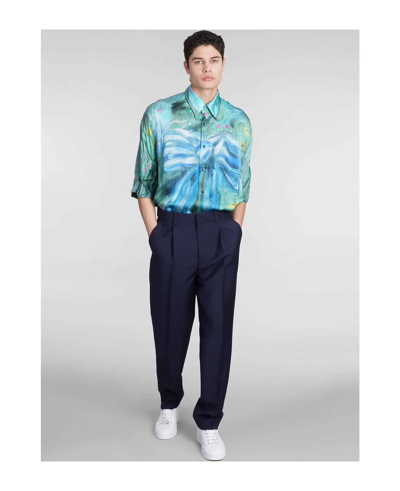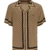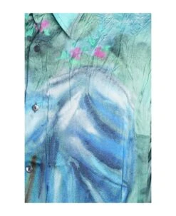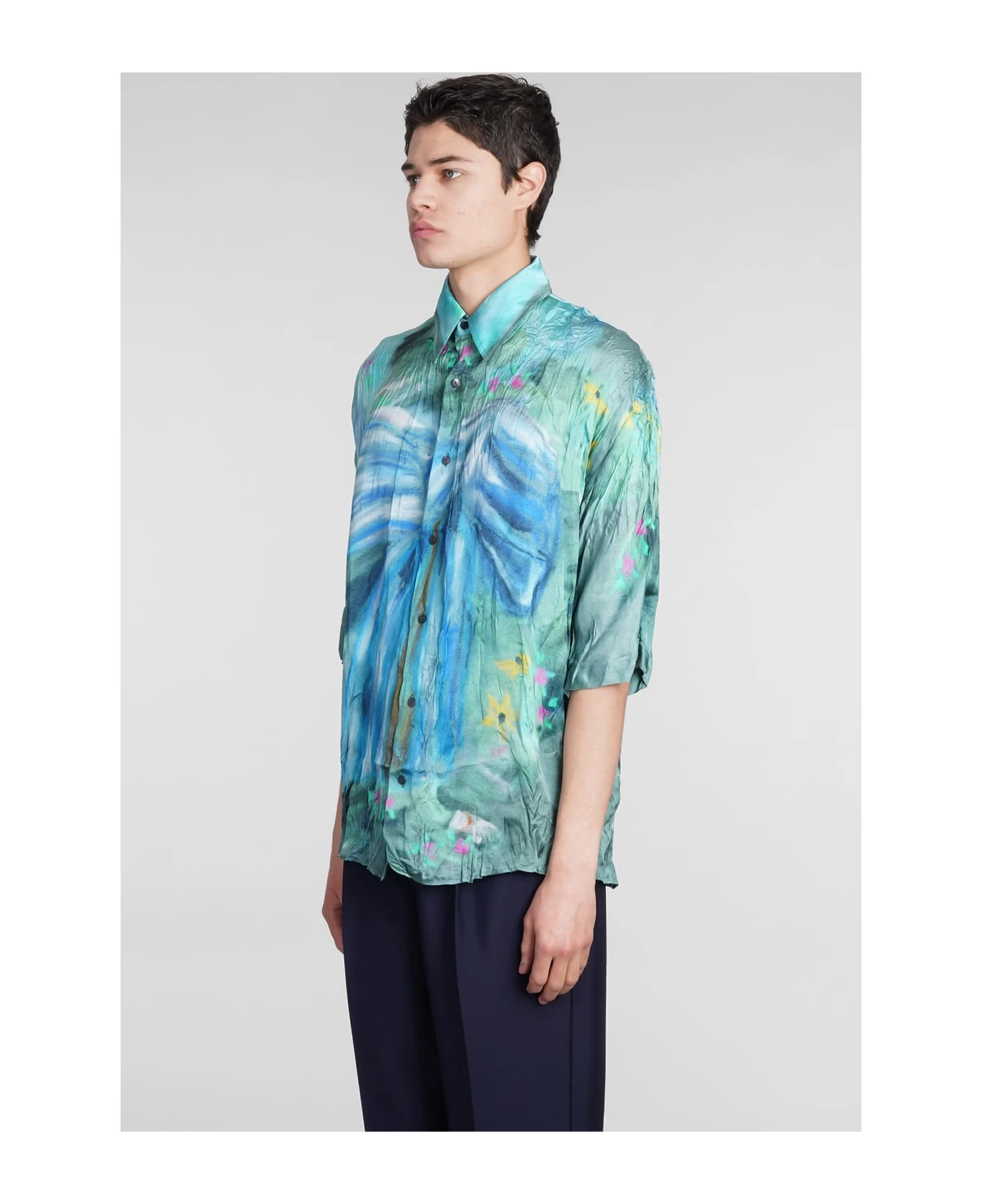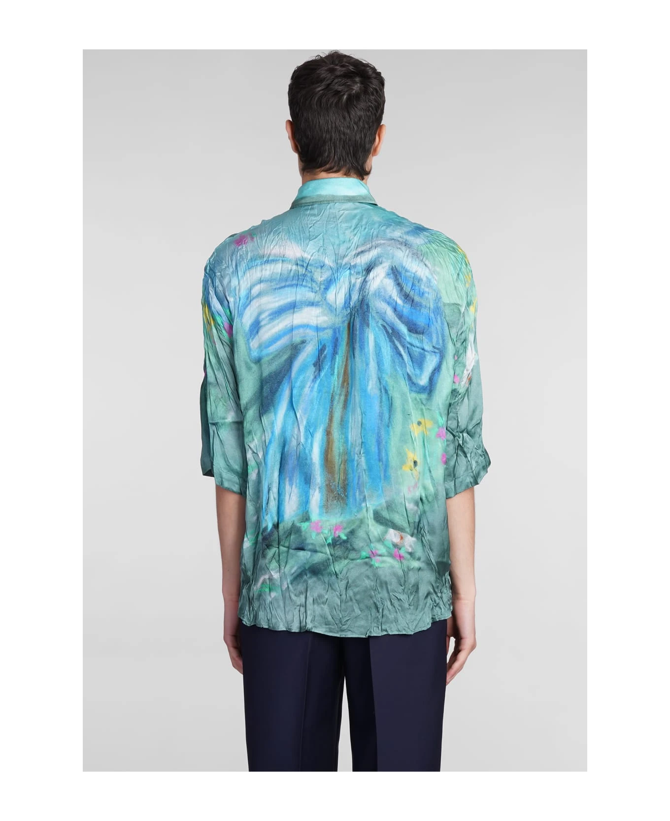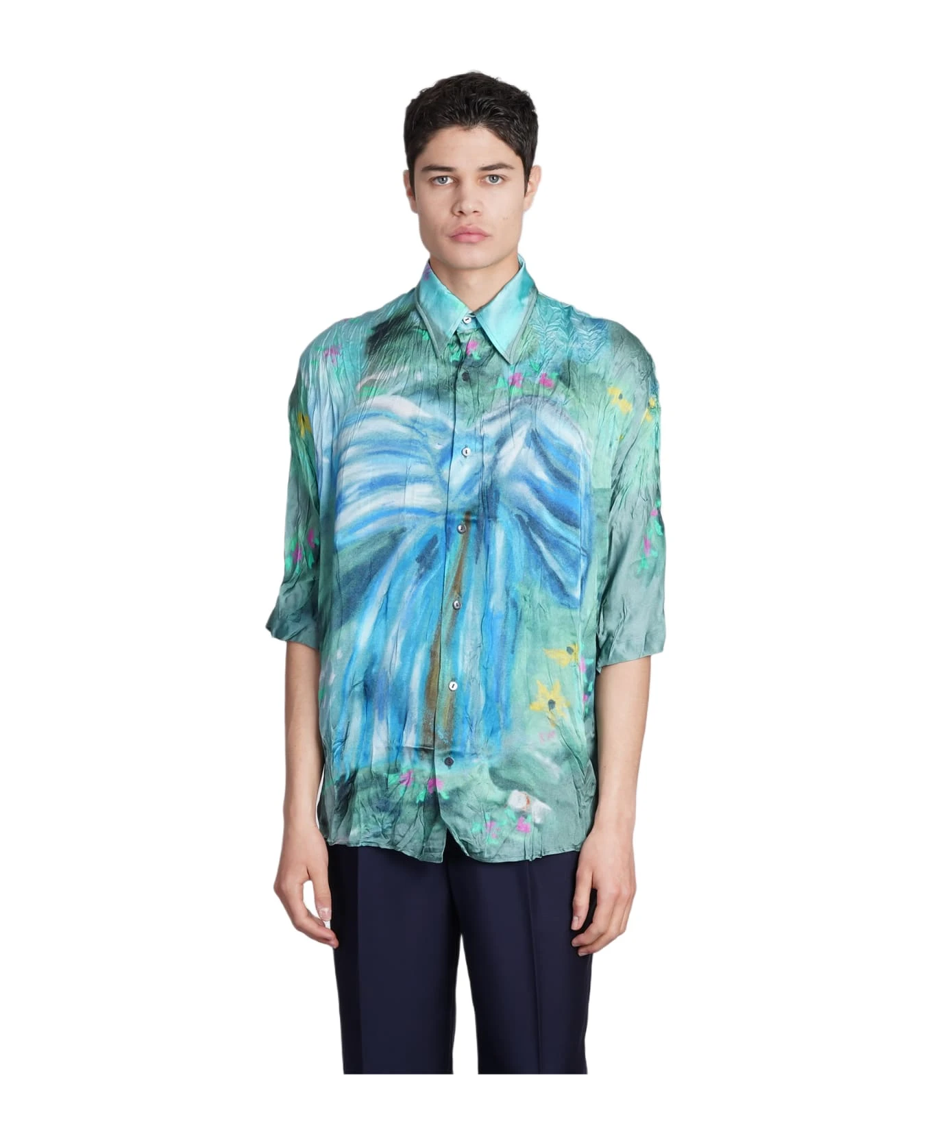 Shirt in green viscose, collar, frontal buttoning, short sleeves, allover pattern, 100% Viscose, Made in Italy, Model is 1. 83 and wears size 46