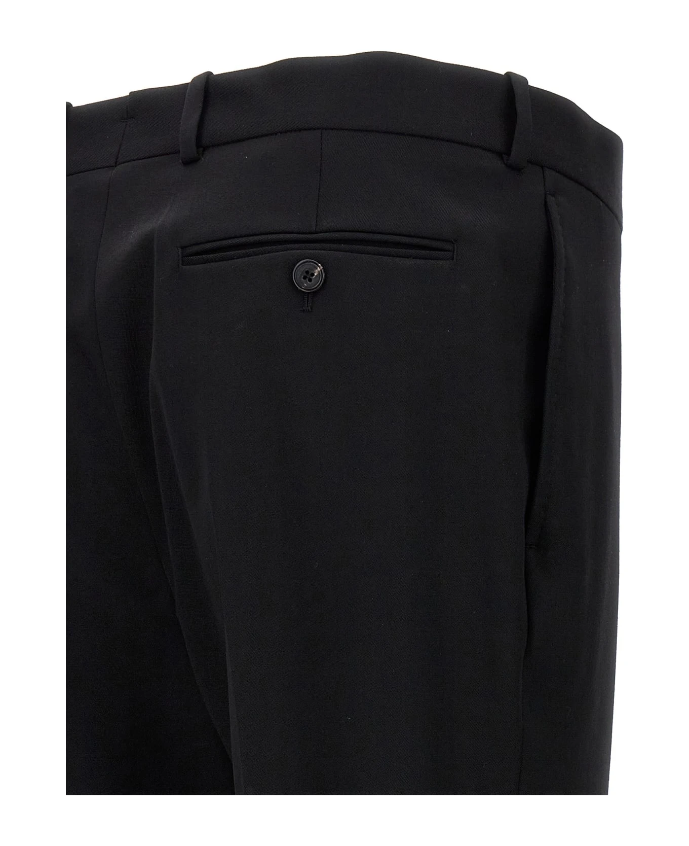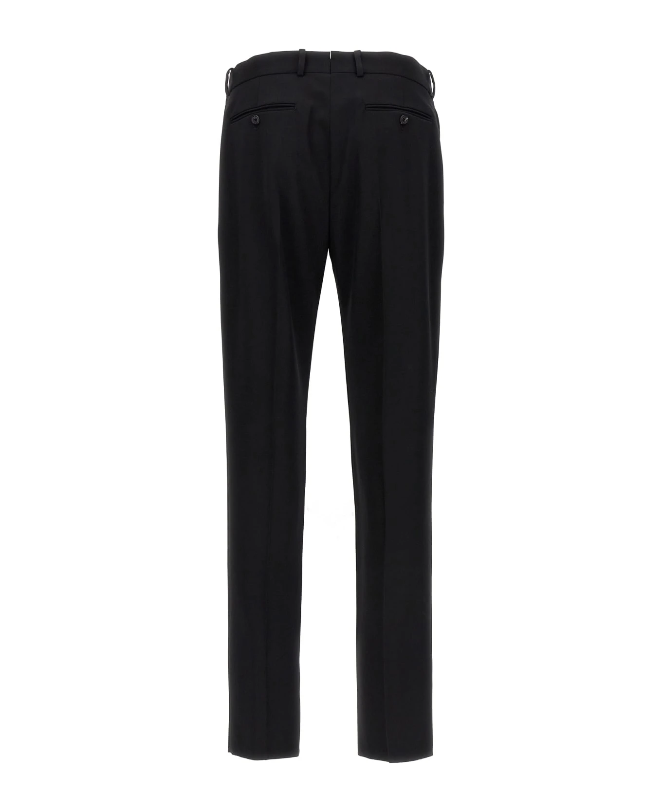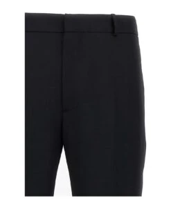 Cigarette-style wool pants with zipper, hook, and button closure, pockets and a central pleat.