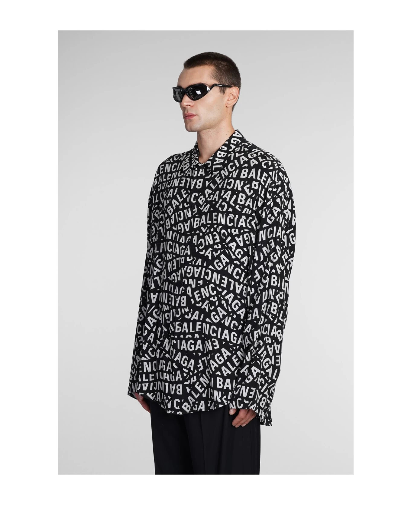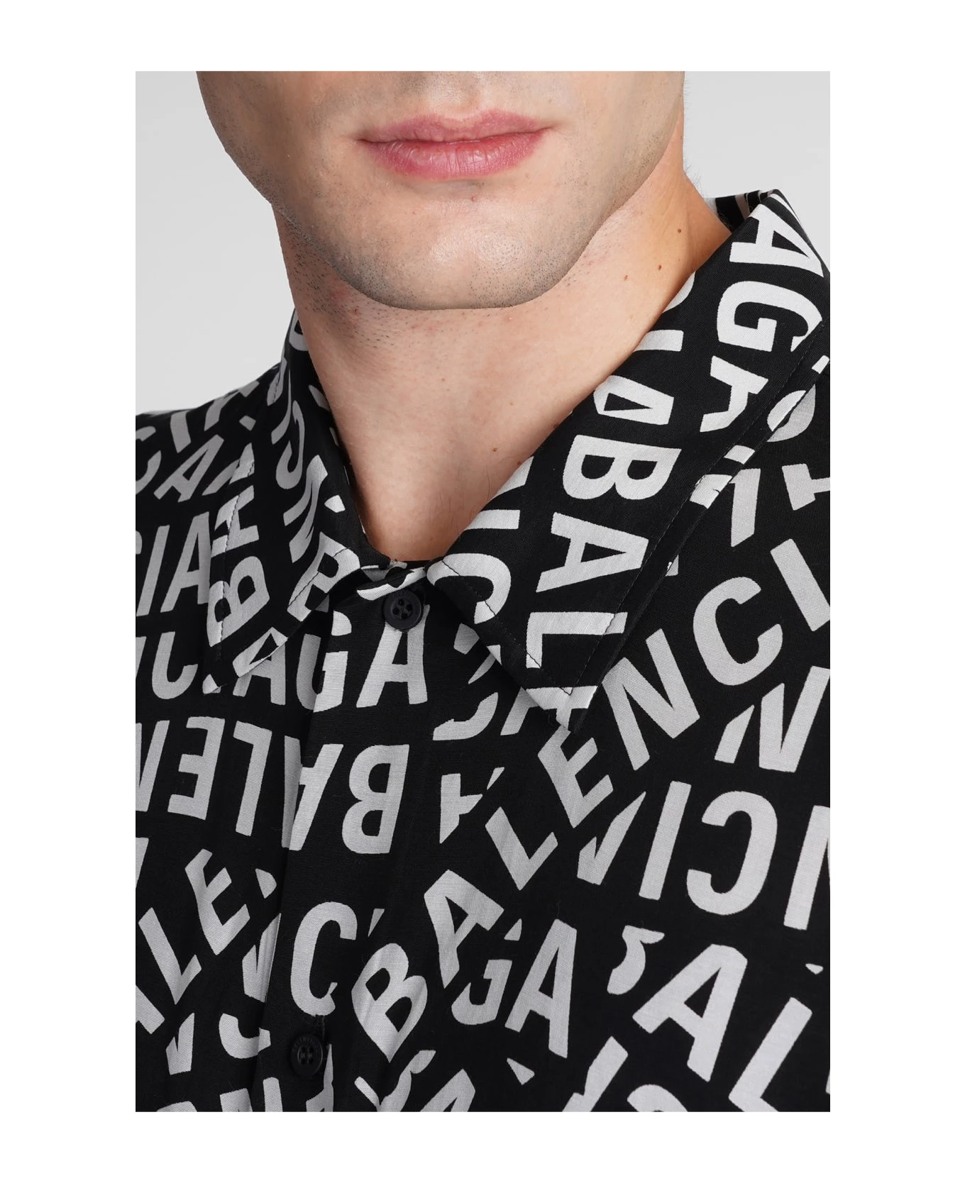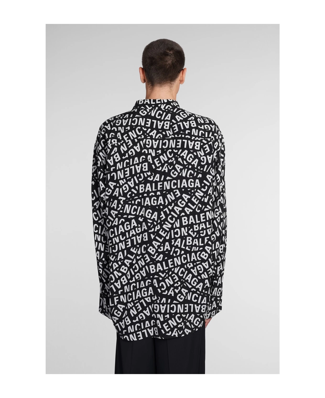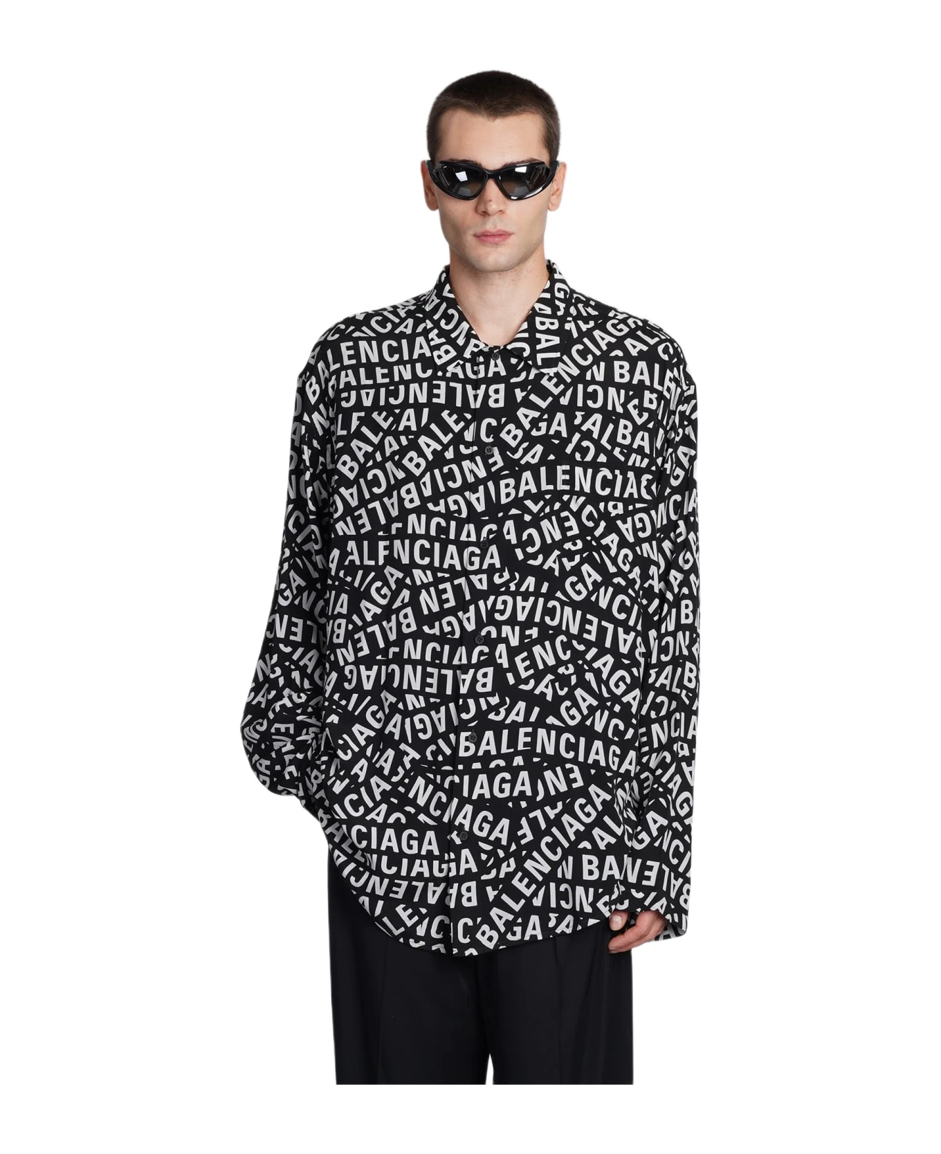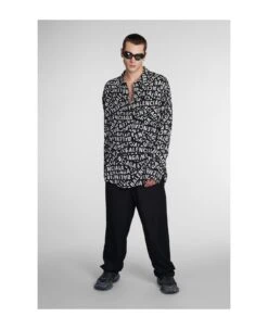 Shirt in black polyamide polyester, collar, long sleeves, frontal buttoning, logo printed, breast pocket, 55% cupro 45% viscose, Made in Madagascar, Model is 1. 83 and wears size 40