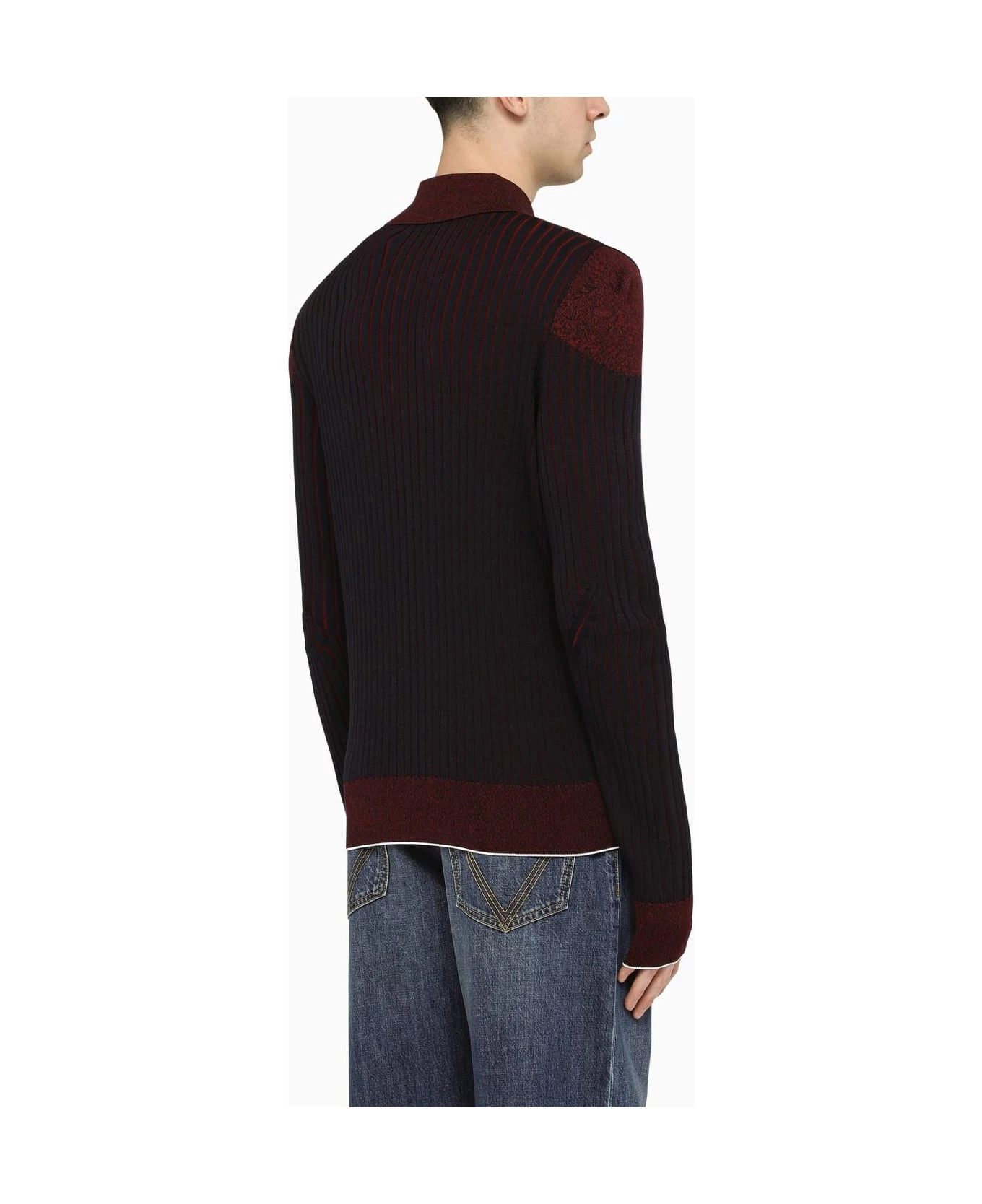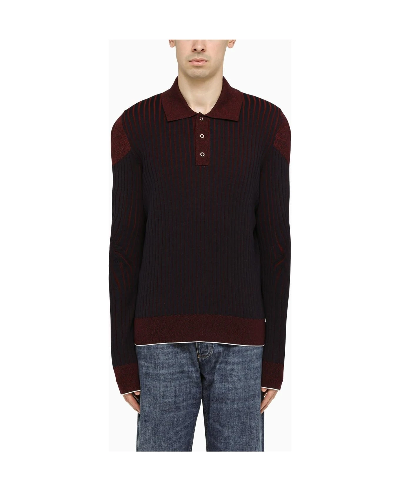 Burgundy and blue cotton long-sleeved polo shirt by Bottega Veneta featuring a ribbed design, a classic collar and button fastening and a slim fit.