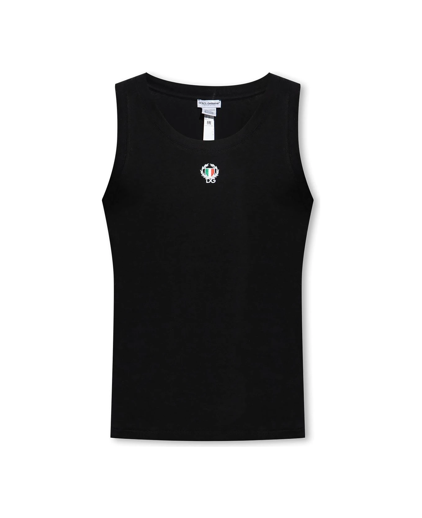 Black T-shirt with a ribbed crew neck from Dolce & Gabbana. Crafted from cotton, this short sleeve design features a multicolored emblem and laurel logo patch.