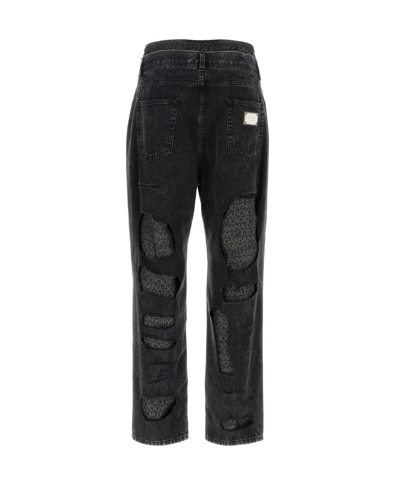 Jeans realized in pure stonewashed and distressed cotton denim with logoed printed silk inserts at the front and the back enriched by logoed metal plate at the back.