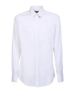 Straight-point collar. Long sleeves. Logo plaque. Front button fastening. Color: white
