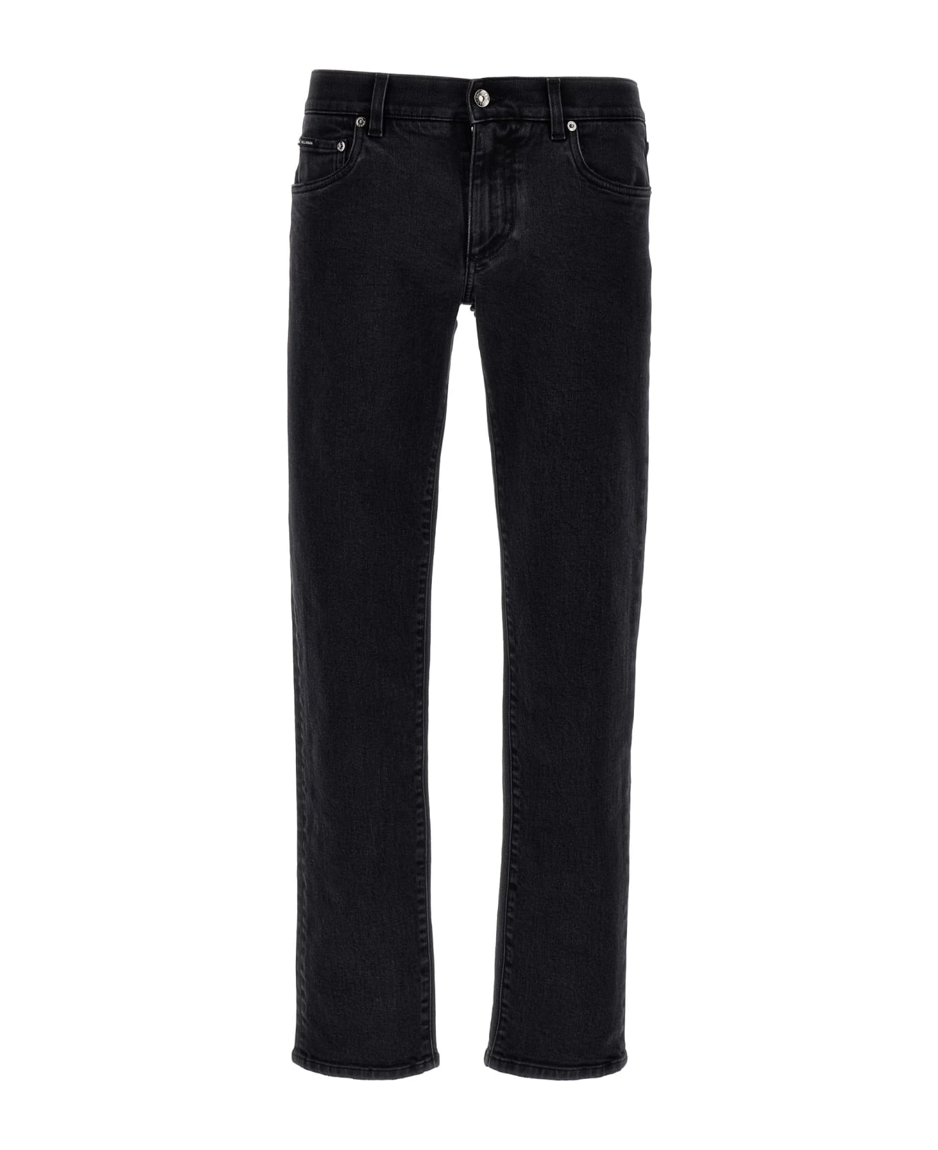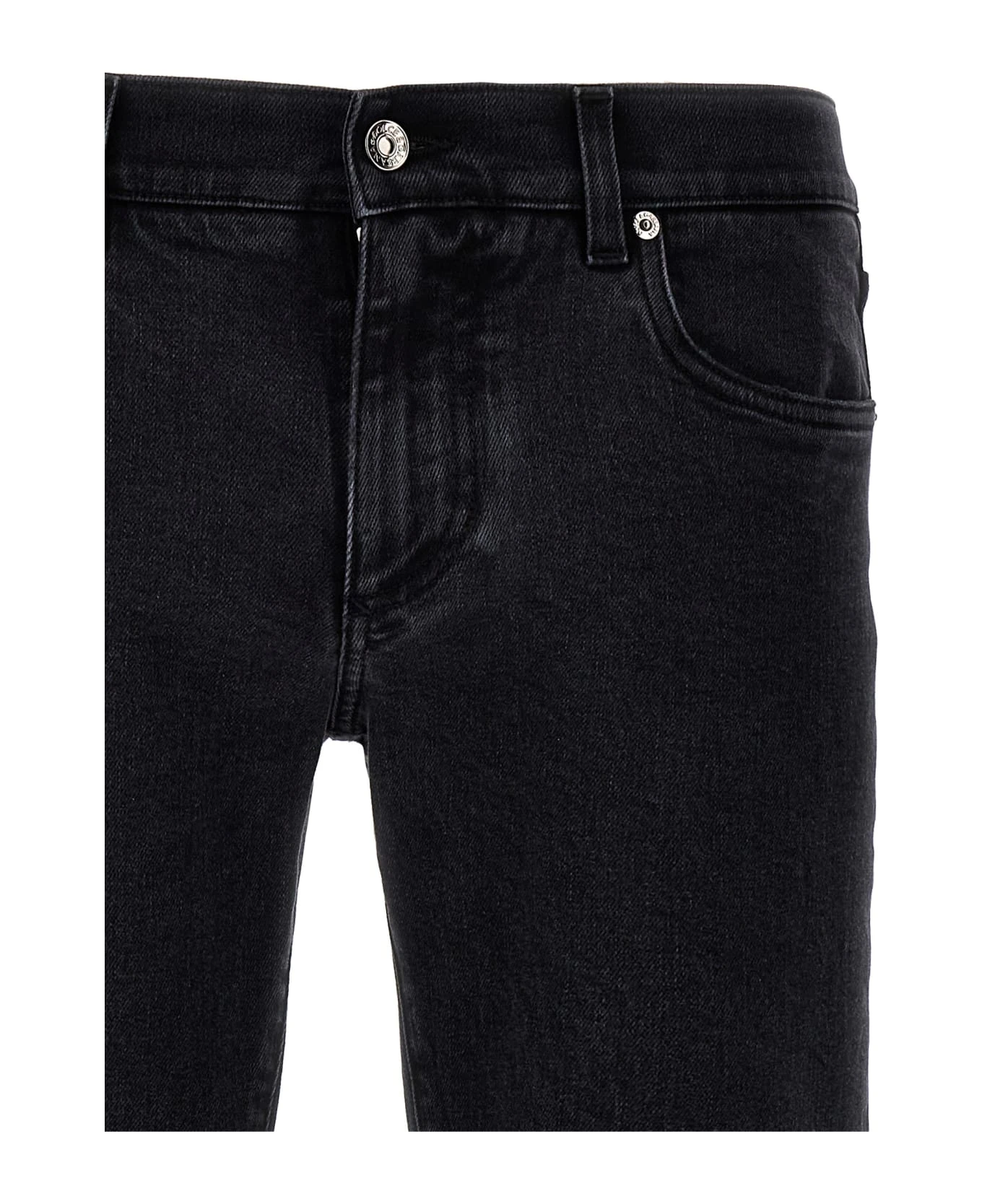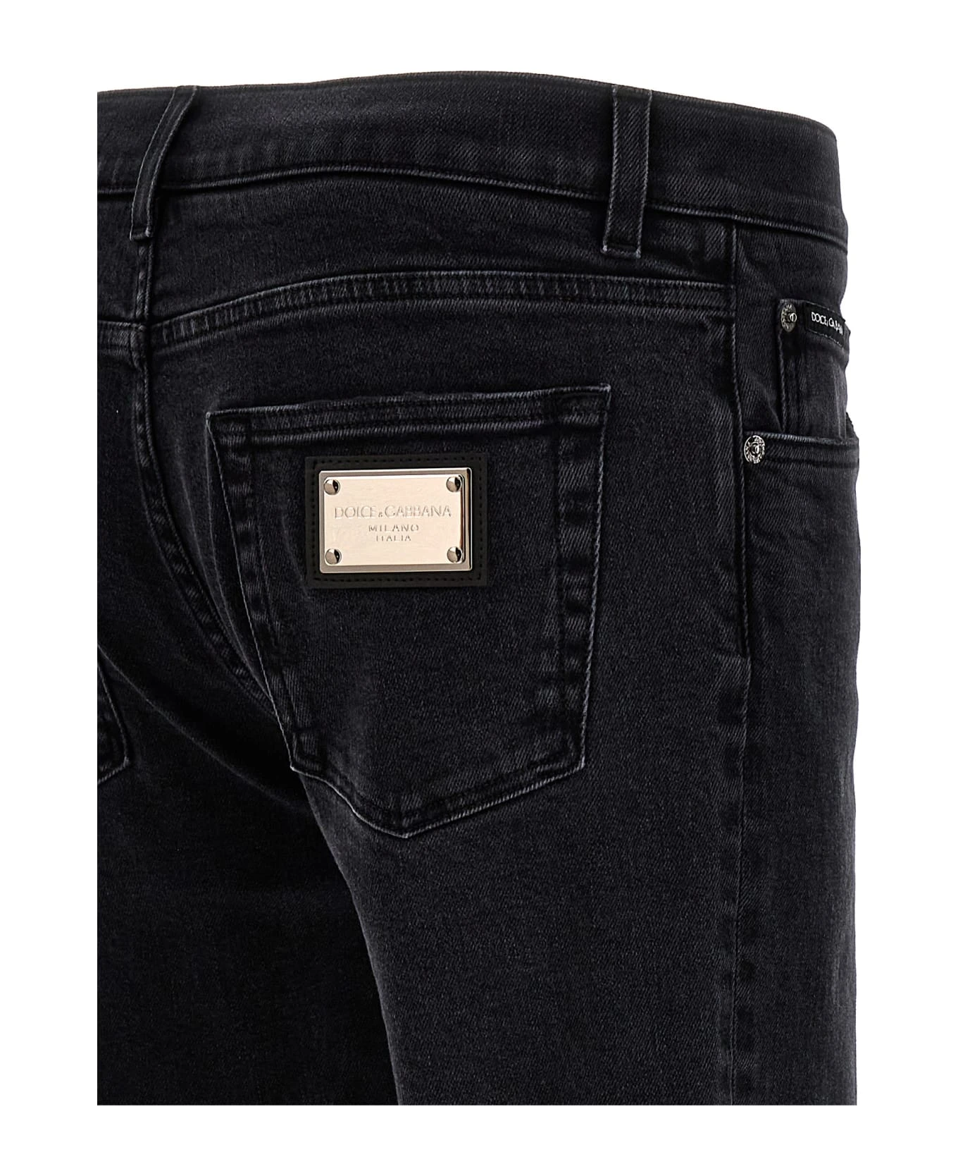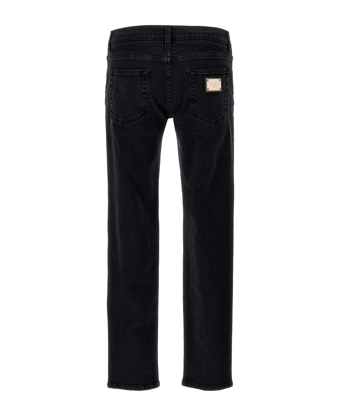 Skinny jeans in stretch cotton denim with zip and button closure, five pockets, and logo plaque on the back.