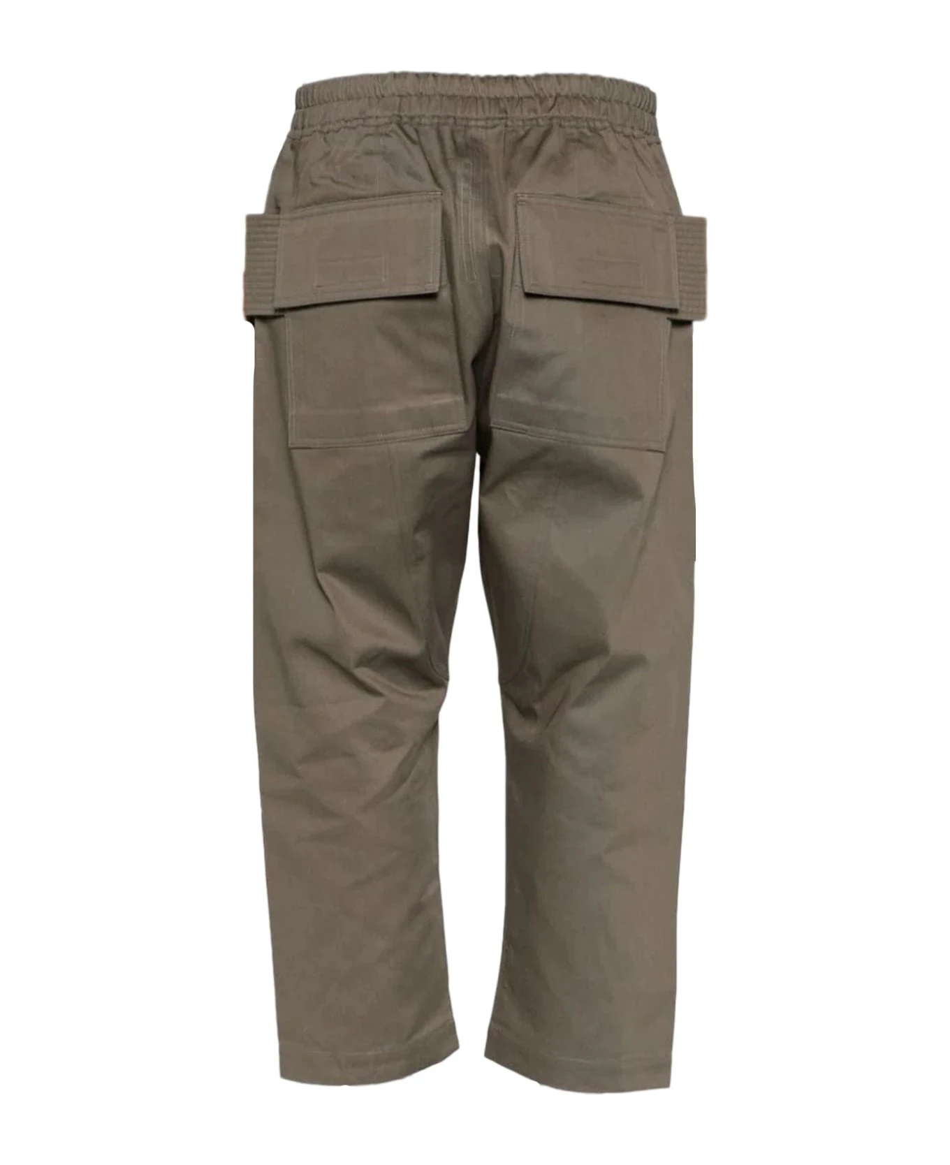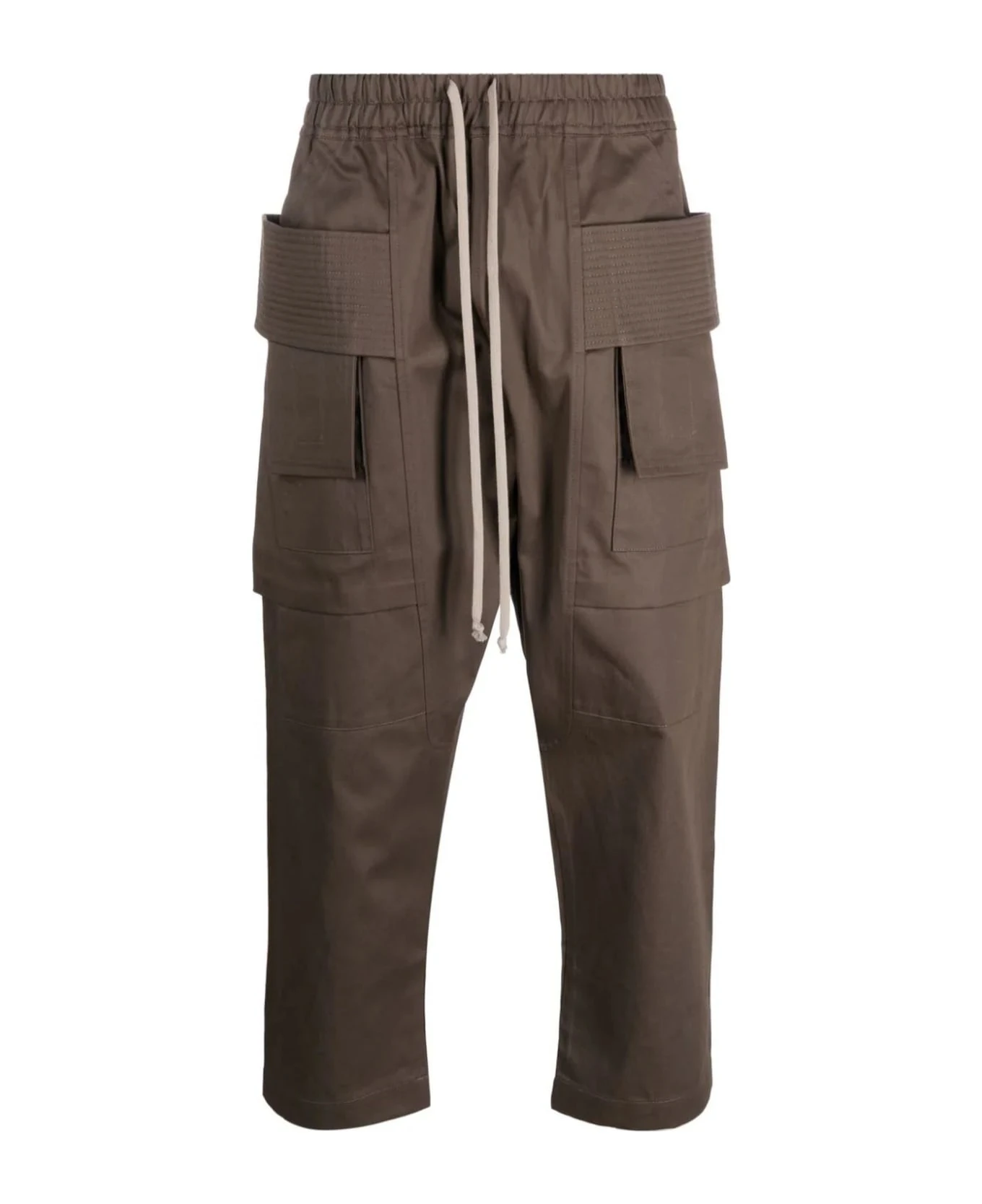Dust brown cotton trousers, straight leg, elasticated drawstring waistband, multiple cargo pockets, cropped leg