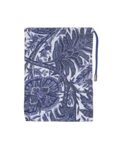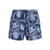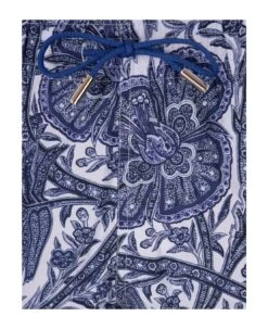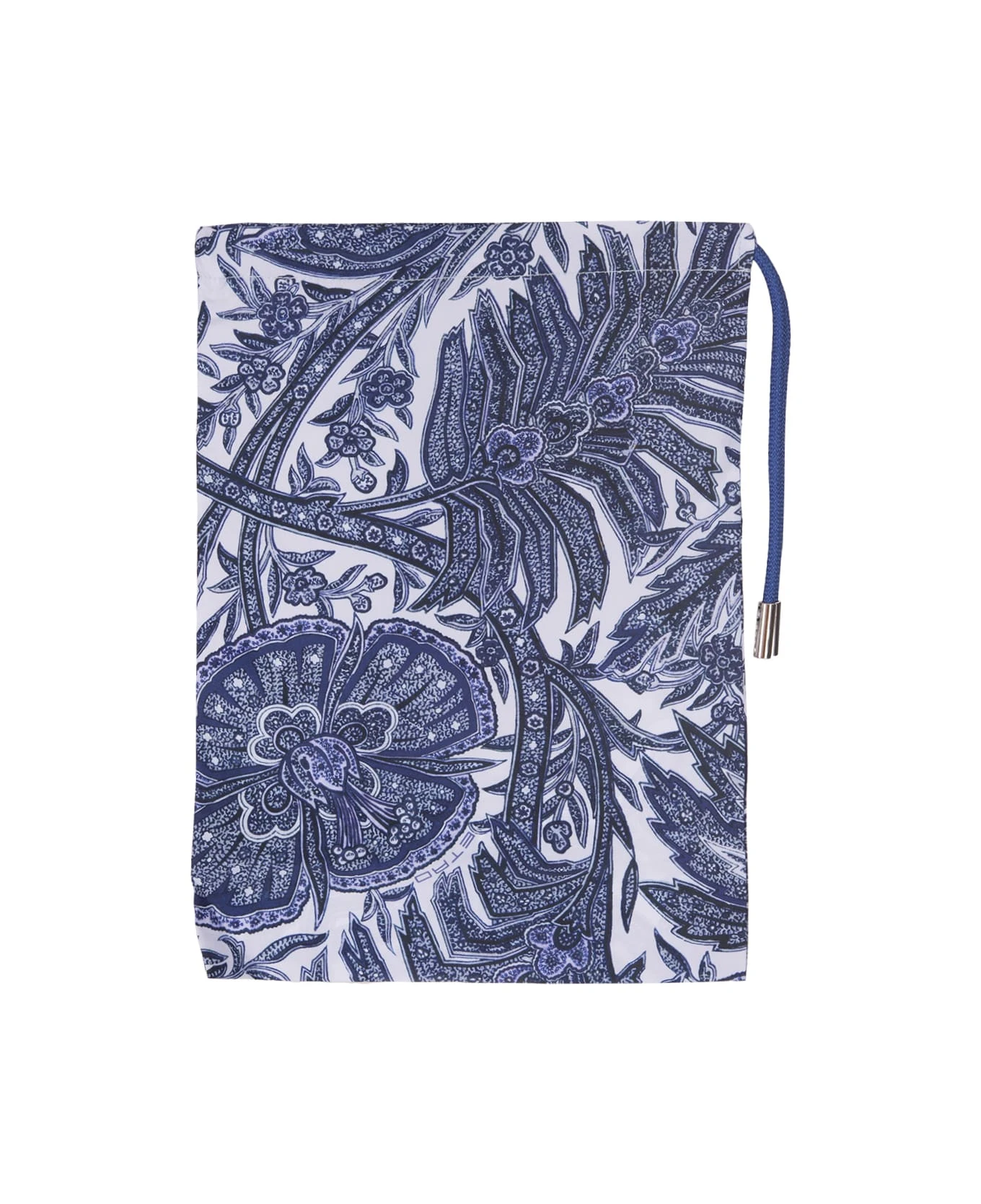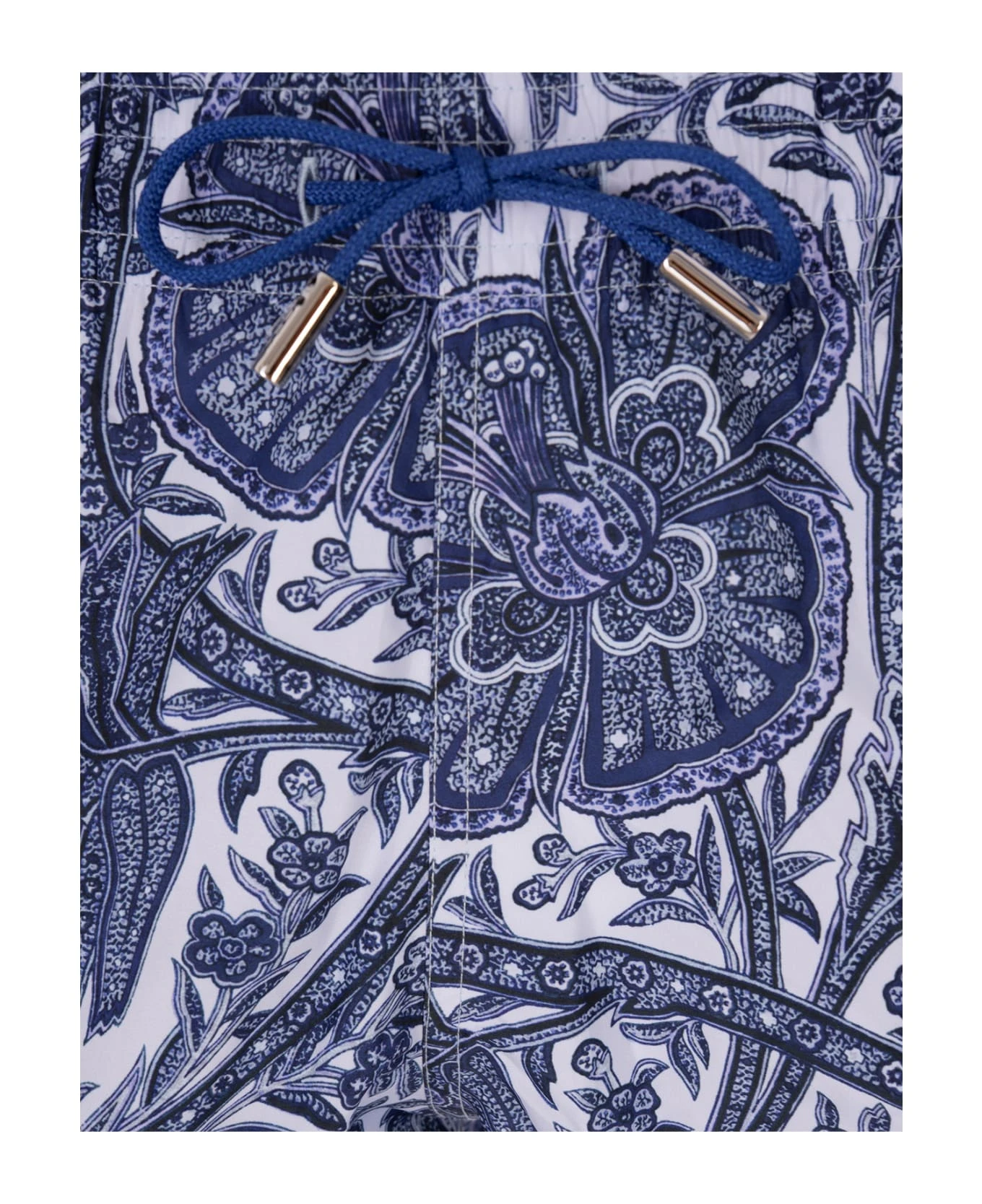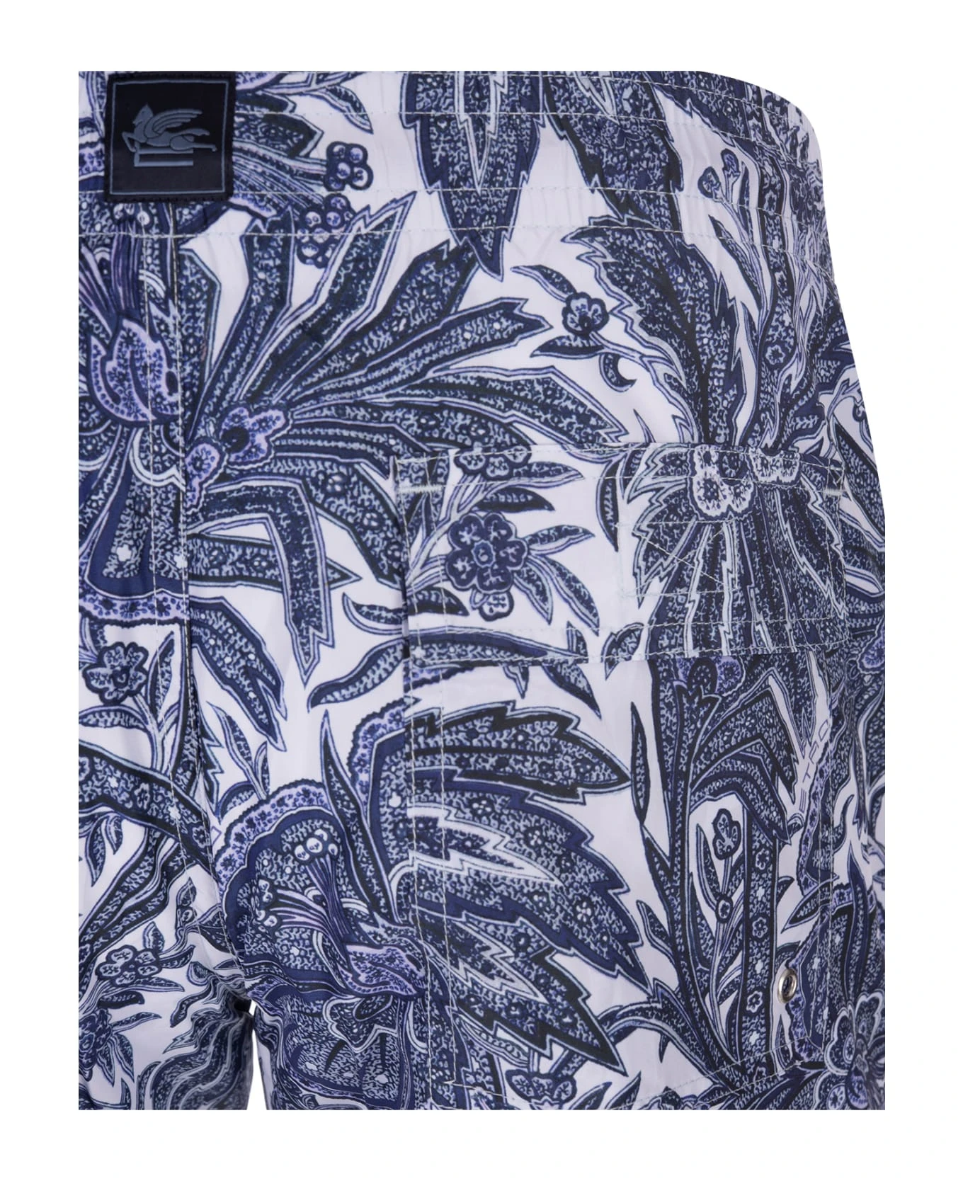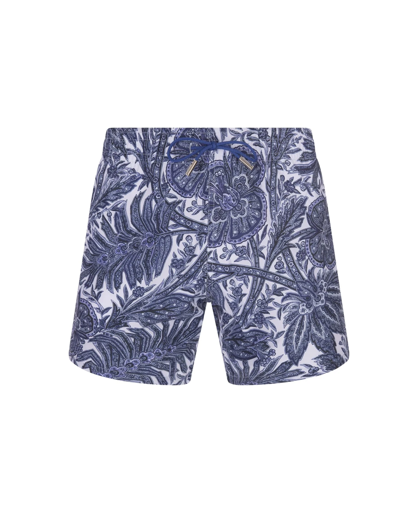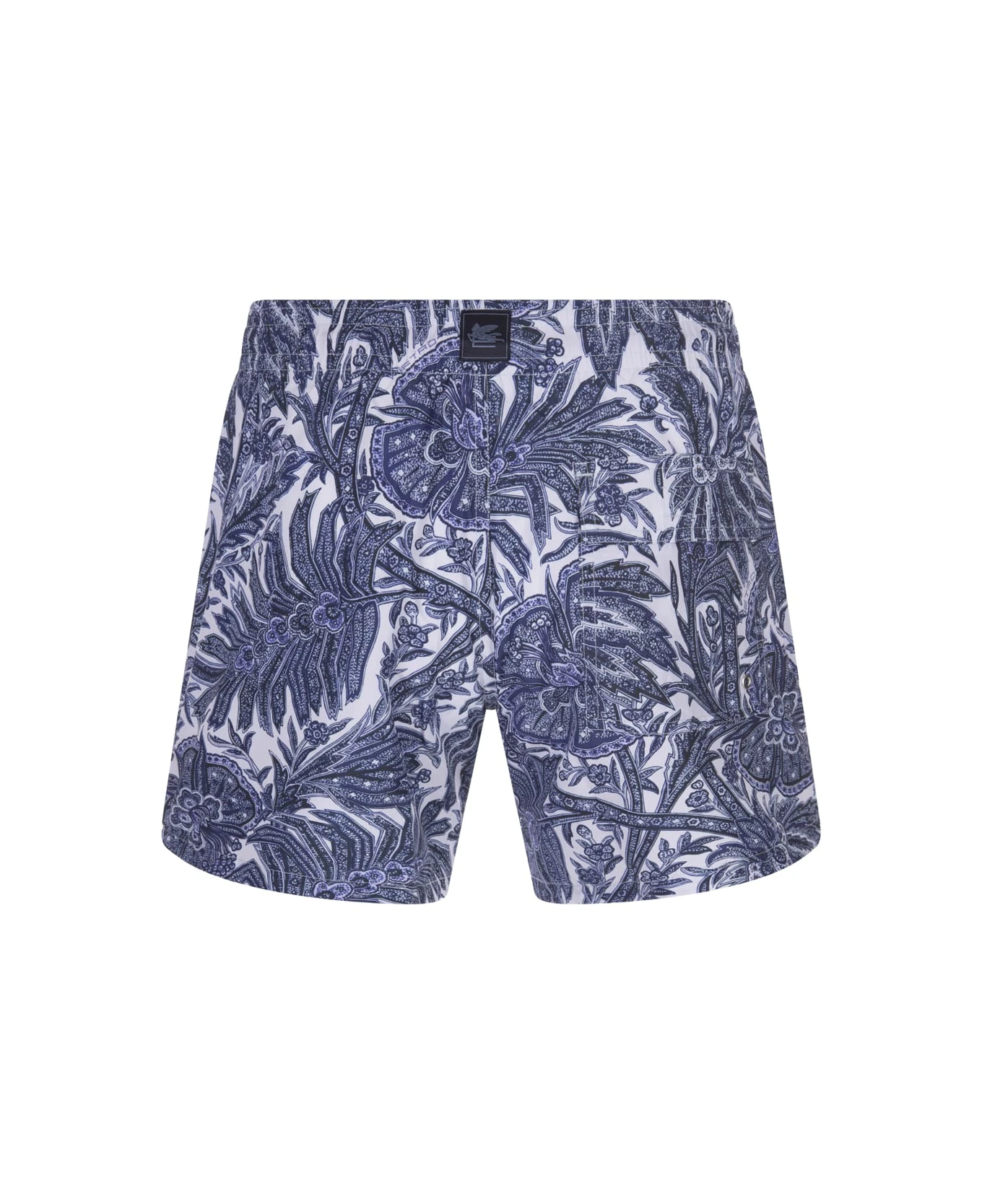 Etro swimsuit for men made of white technical fabric and decorated with an all-over blue print with foliage floral motifs. The garment features an elasticated waistband with matching drawstring and Etro logo patch with Pegasus stitched on the back.
