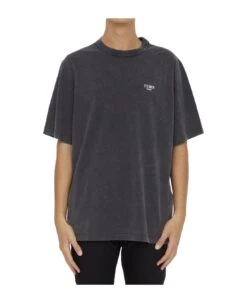 Short-sleeved crewneck t-shirt in black washed cotton jersey with metal Fendi Roma lettering on chest. Wide fit.
