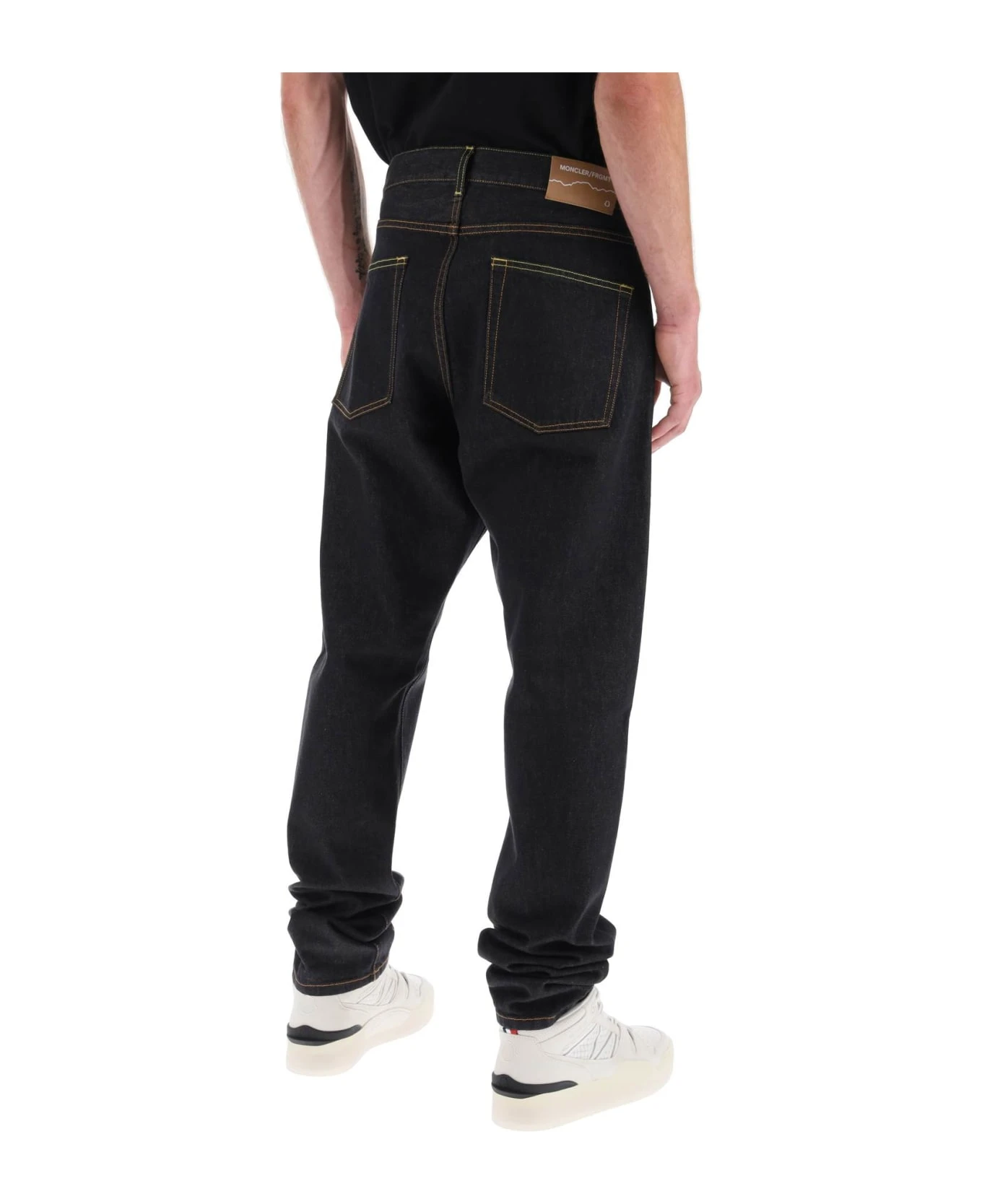 Five-pocket jeans from Moncler x FRGMT, part of the Moncler Genius project, made of used-effect denim with contrast stitching throughout and printed lettering on the left side. Cut to a relaxed fit with mid-rise waist, this style is fastened with a zip fly and a monogram button. The model is 187 cm tall and wears a size IT 48.