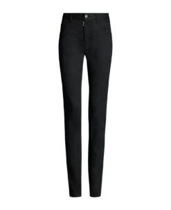 Black cotton blend denim jeans, stretch-design, signature four-stitch logo, contrast stitching, belt loops, front button and zip fastening, classic five pockets, straight leg, straight hem
