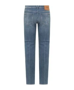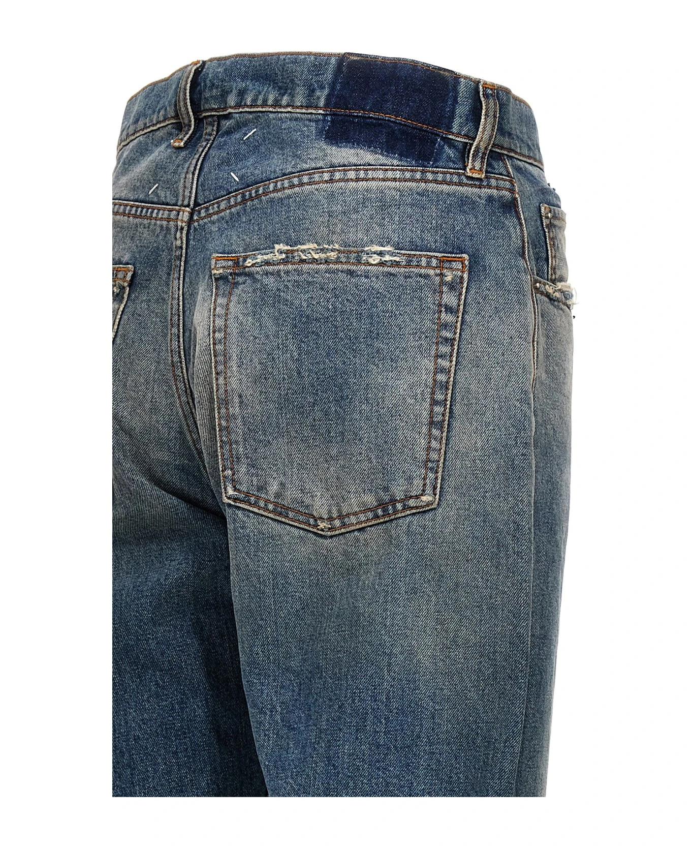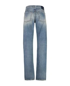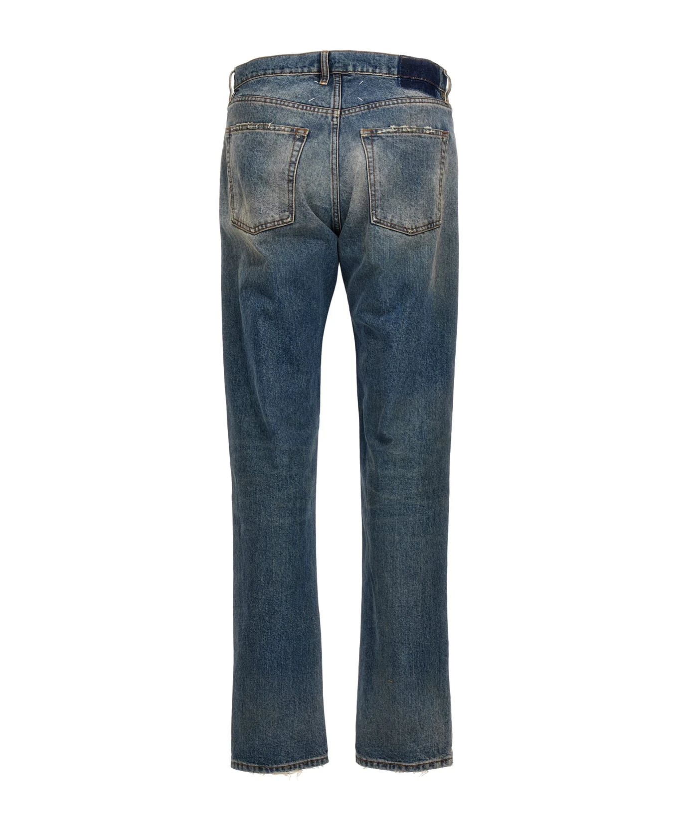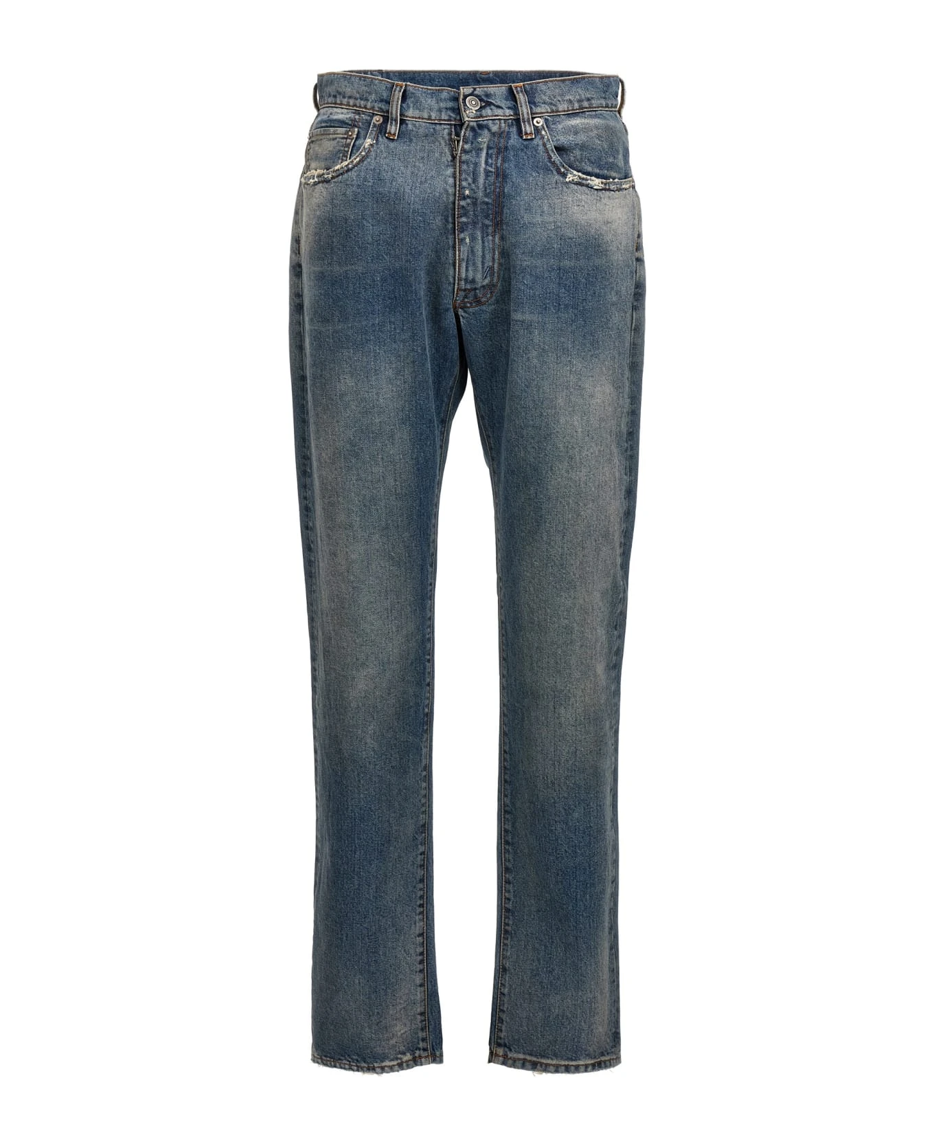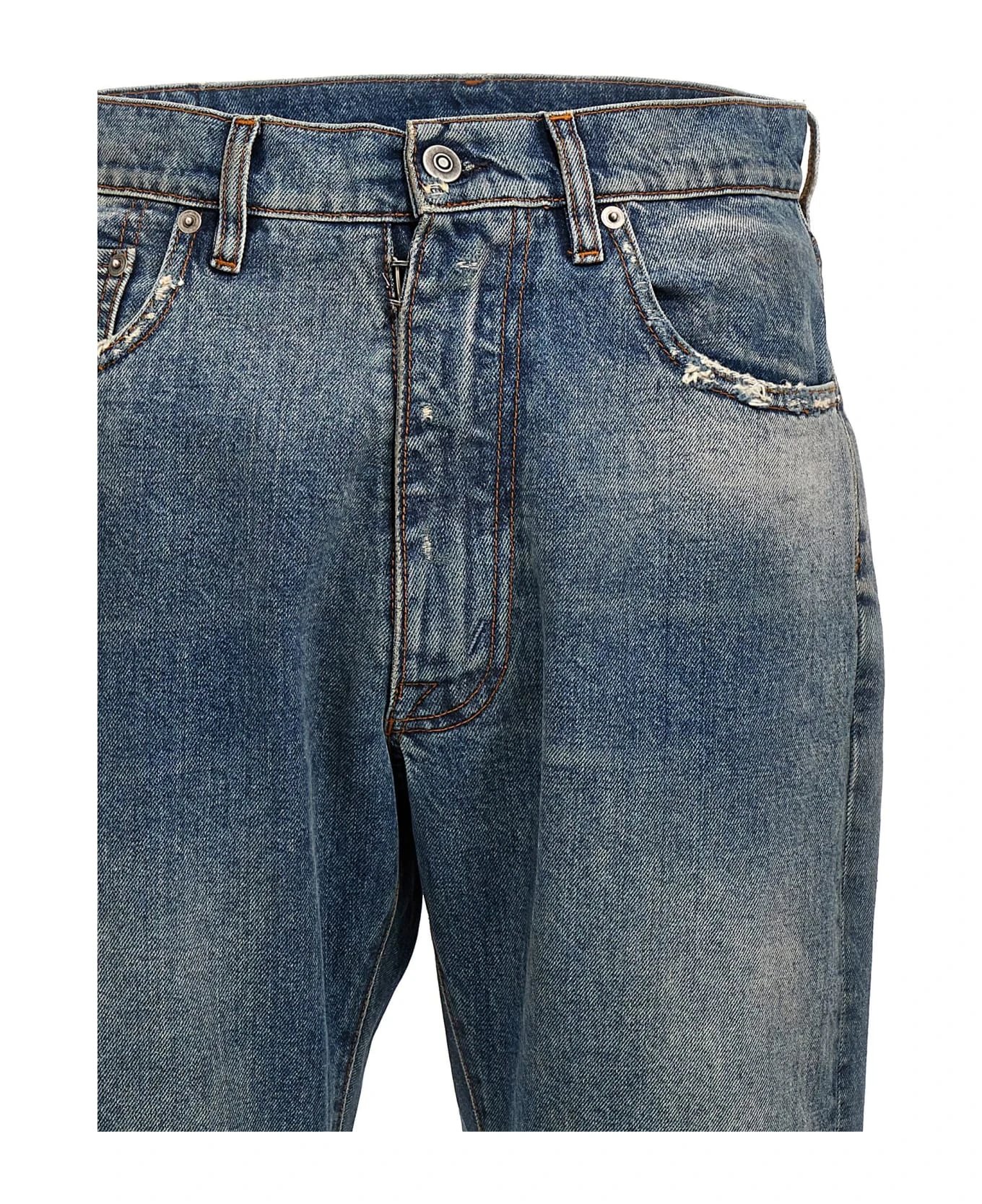 Stone wash denim jeans with worn effect, button and hook zip closure. Straight leg, regular waist.