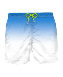 Mens Swim Shorts mid-lenght, bluette and white gradient print;regular fit, microfiber, inside ergonomic brief, pockets on both sides, drawcord closure, backside classic pocket with velcro closure.
