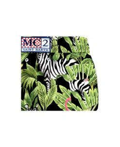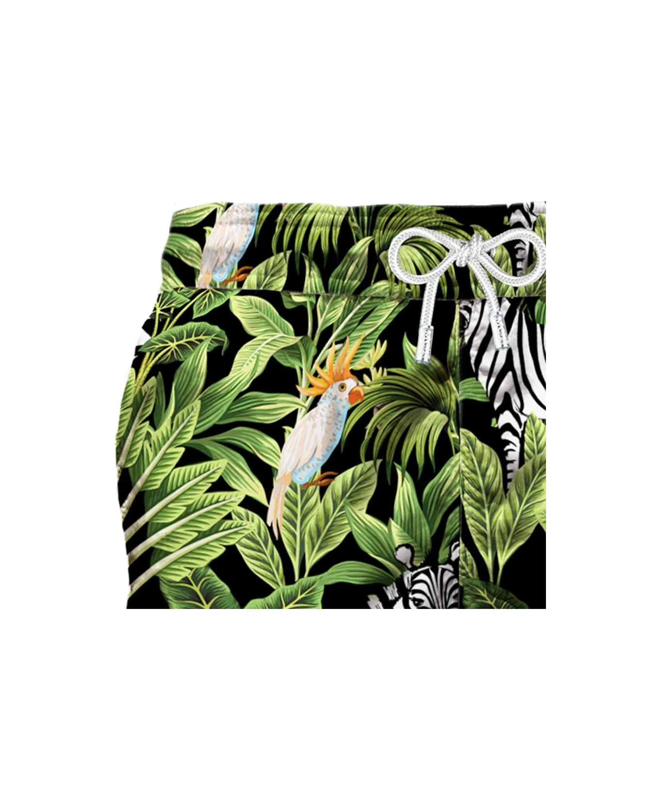 Men’s Swimsuit, tropical birds print on a black background with green leaves, mid-length swim shorts, regular fit, drawcord closure, inside ergonomic brief, pockets on both sides, backside classic pocket with velcro closure. CARE INSTRUCTIONSCold wash by running water and neutral soap. Hang to dry. Do not dry in contact with other clothes.