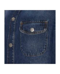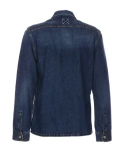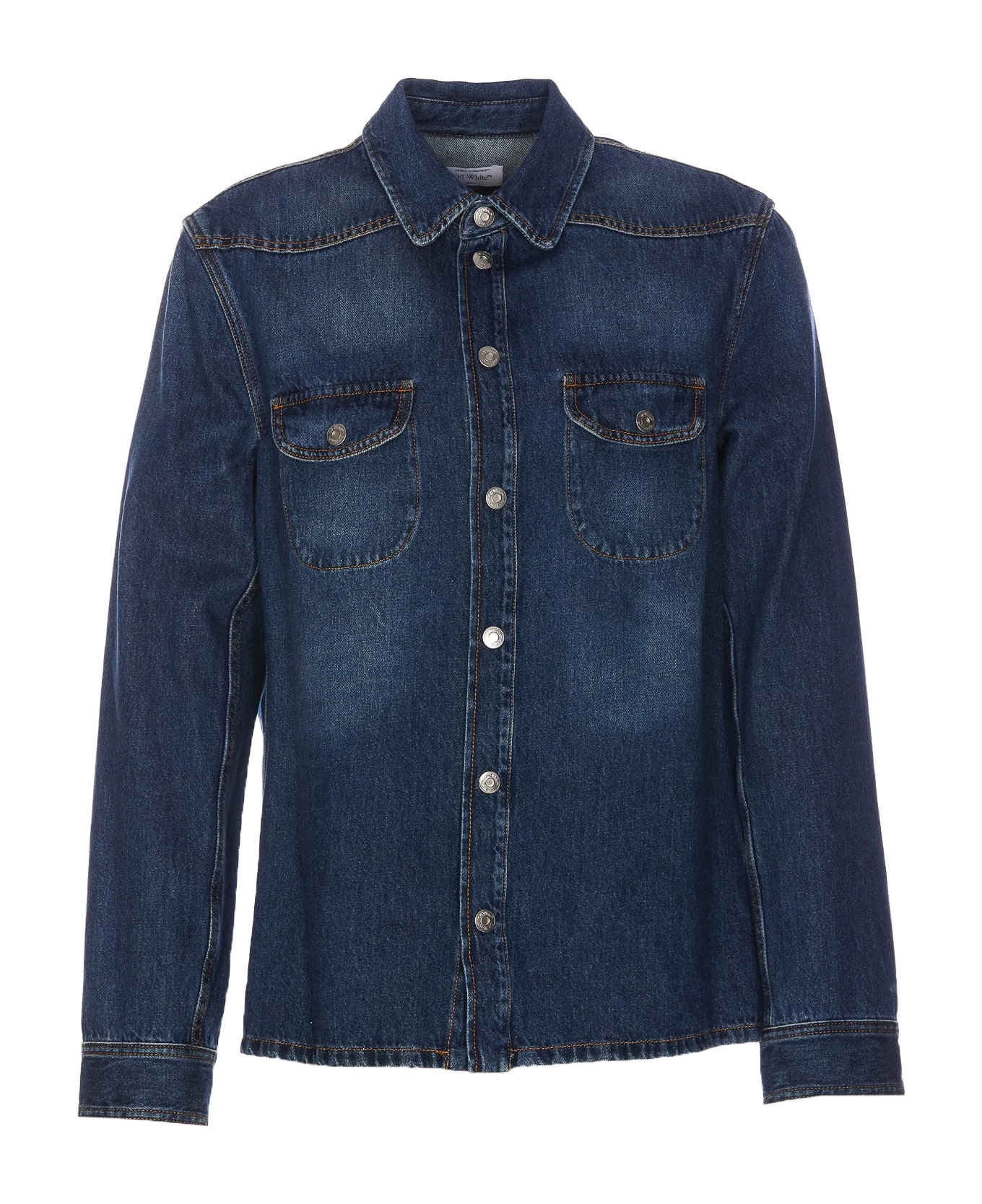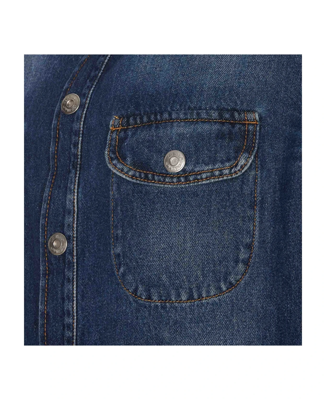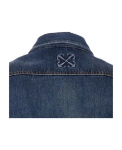 Off White denim shirt with frotal buttons closure, regular collar, embroidered logo on the back