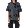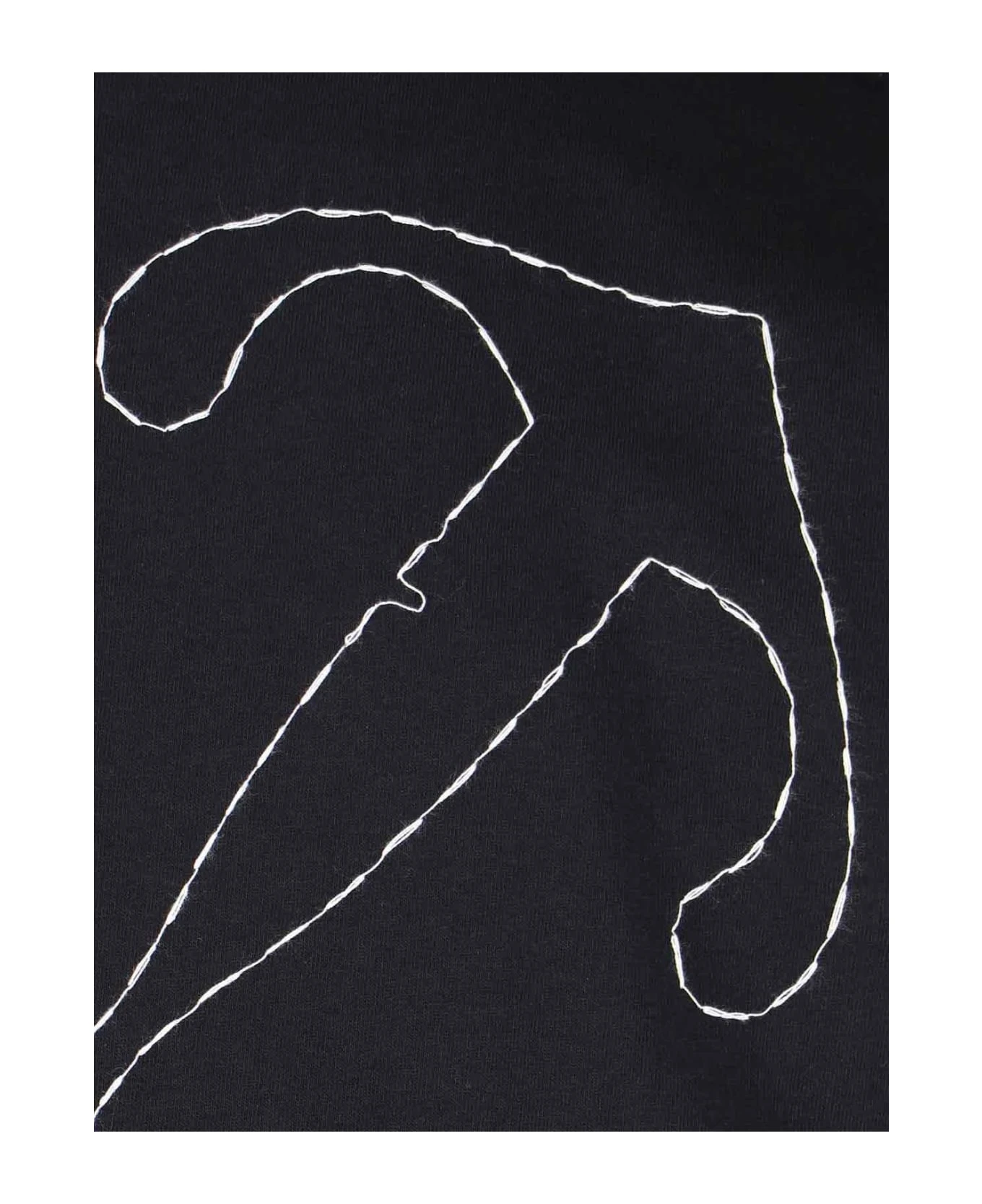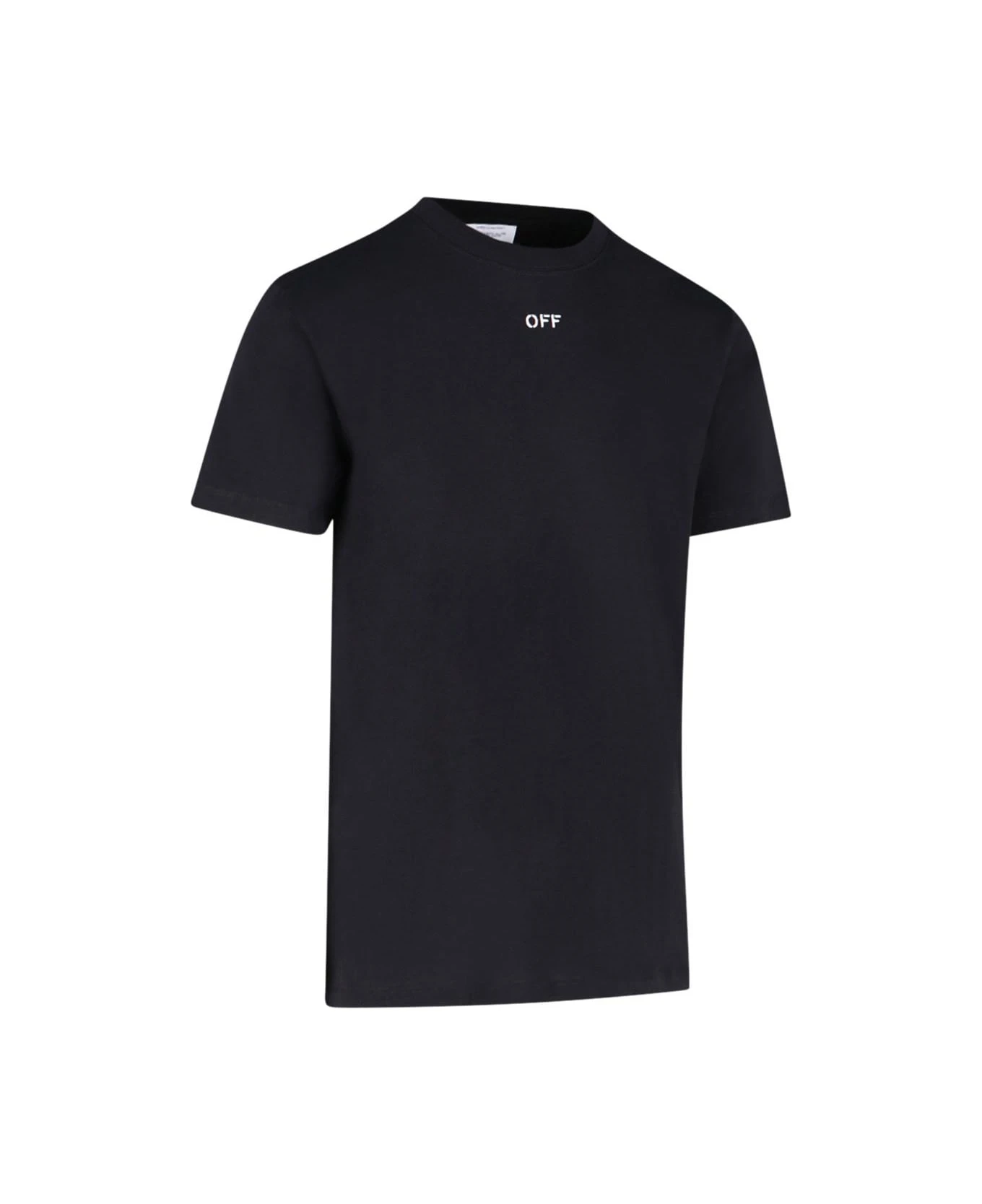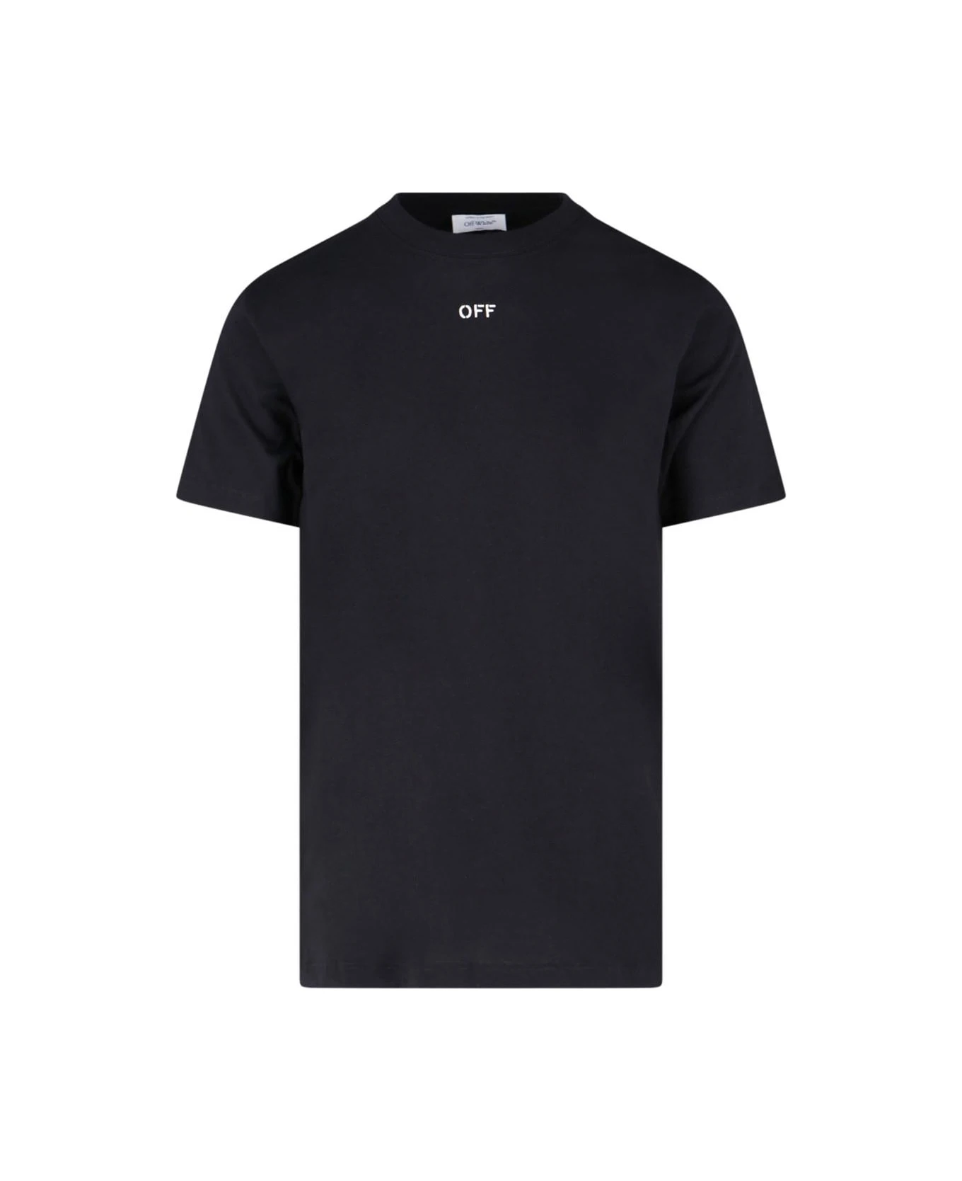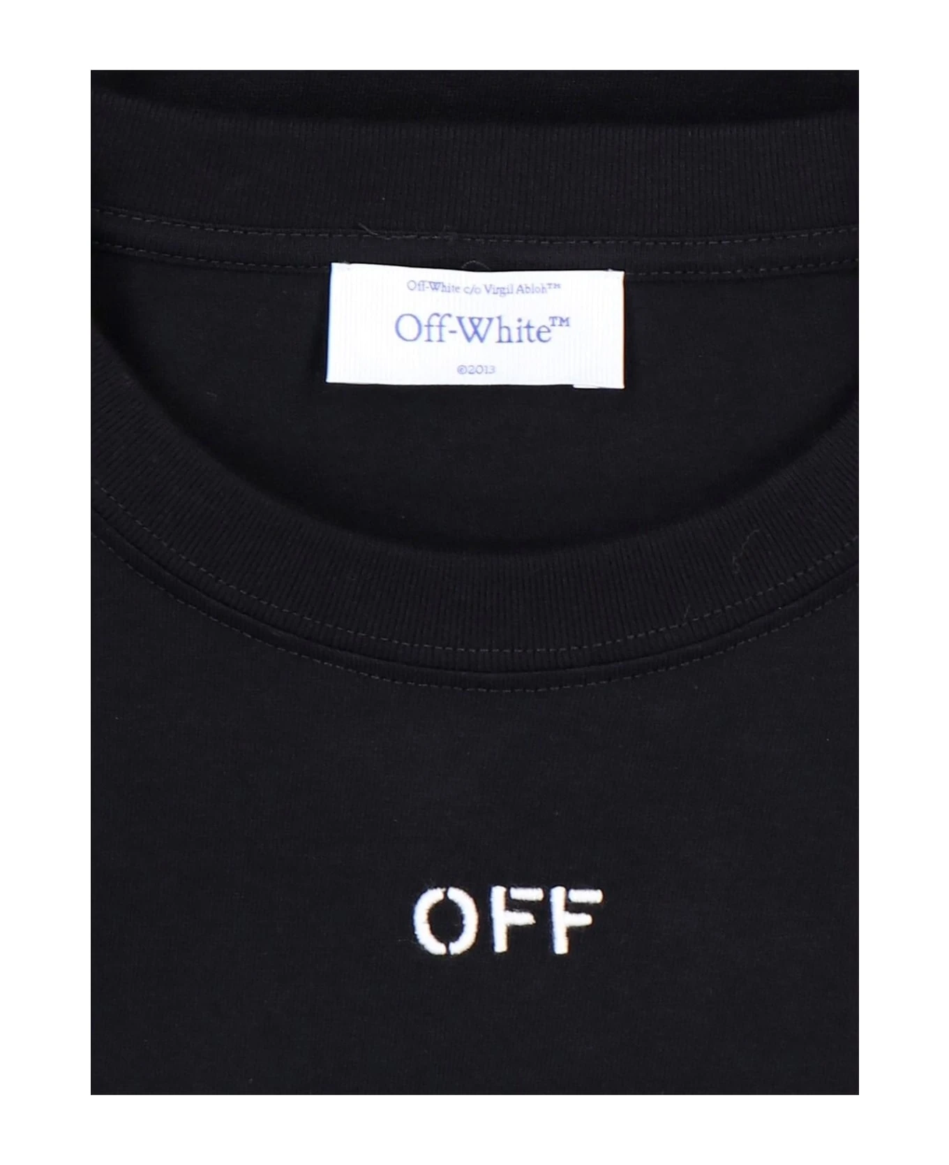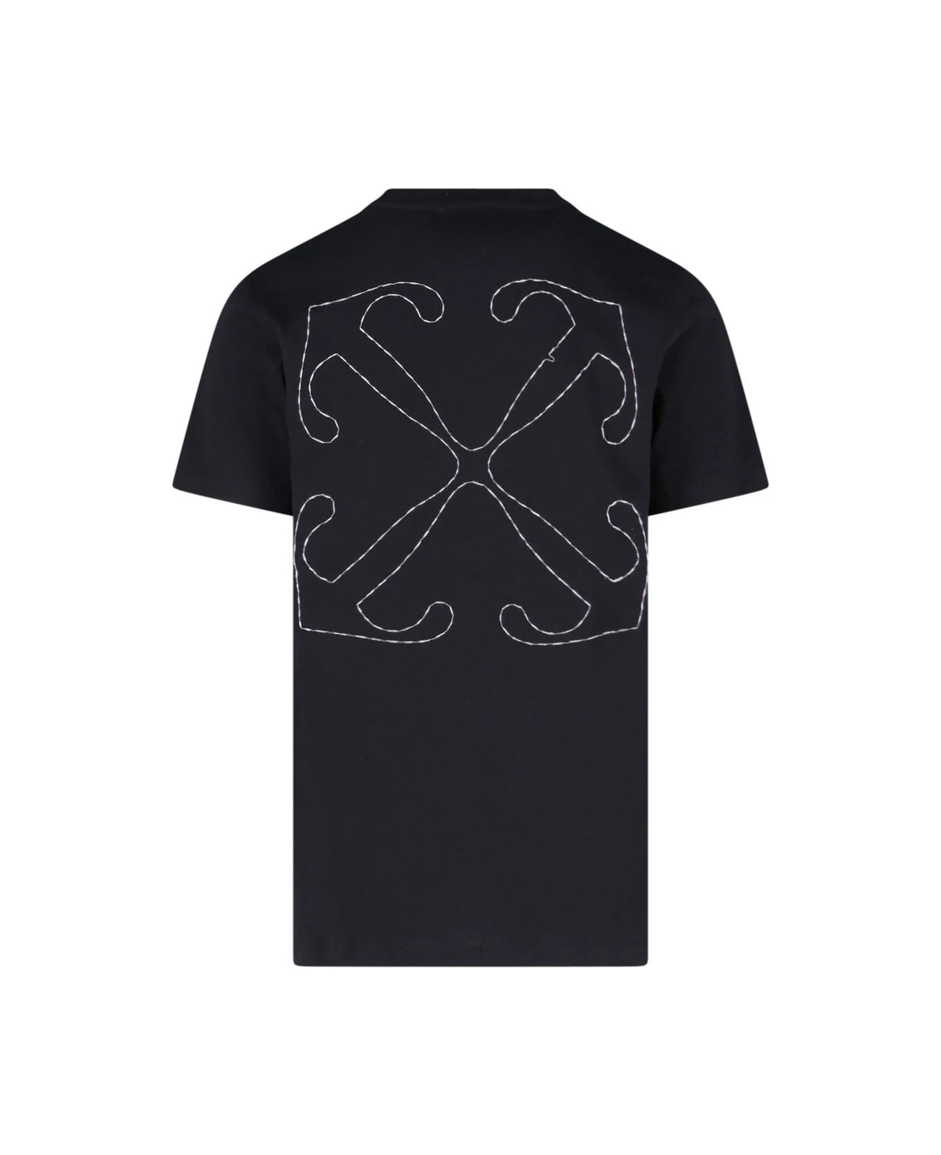 Off-White back embroidery T-shirt in black cotton with ribbed crewneck, short sleeves, white embroidered logo on the front, iconic white ‘arrow’ embroidery on the back, and straight hem.