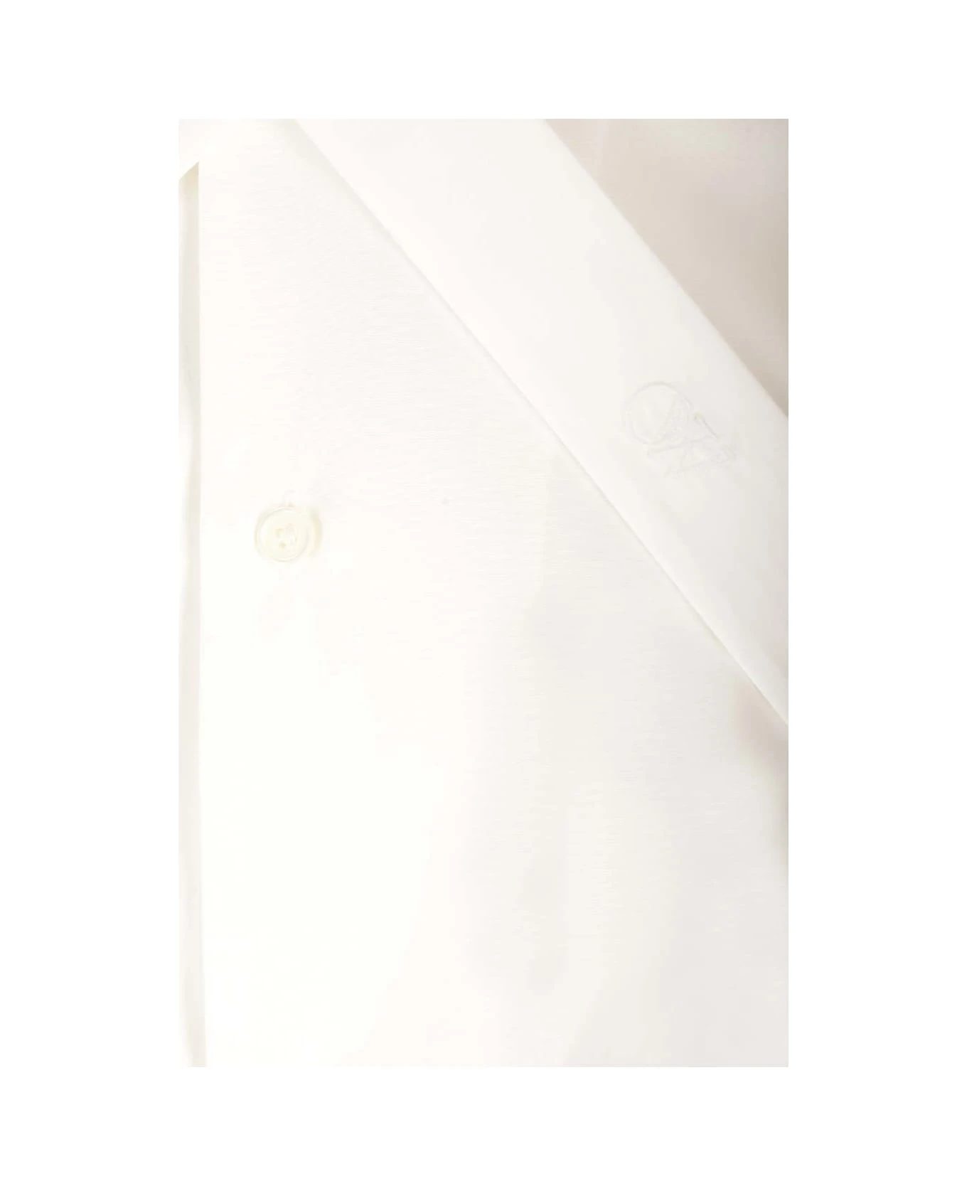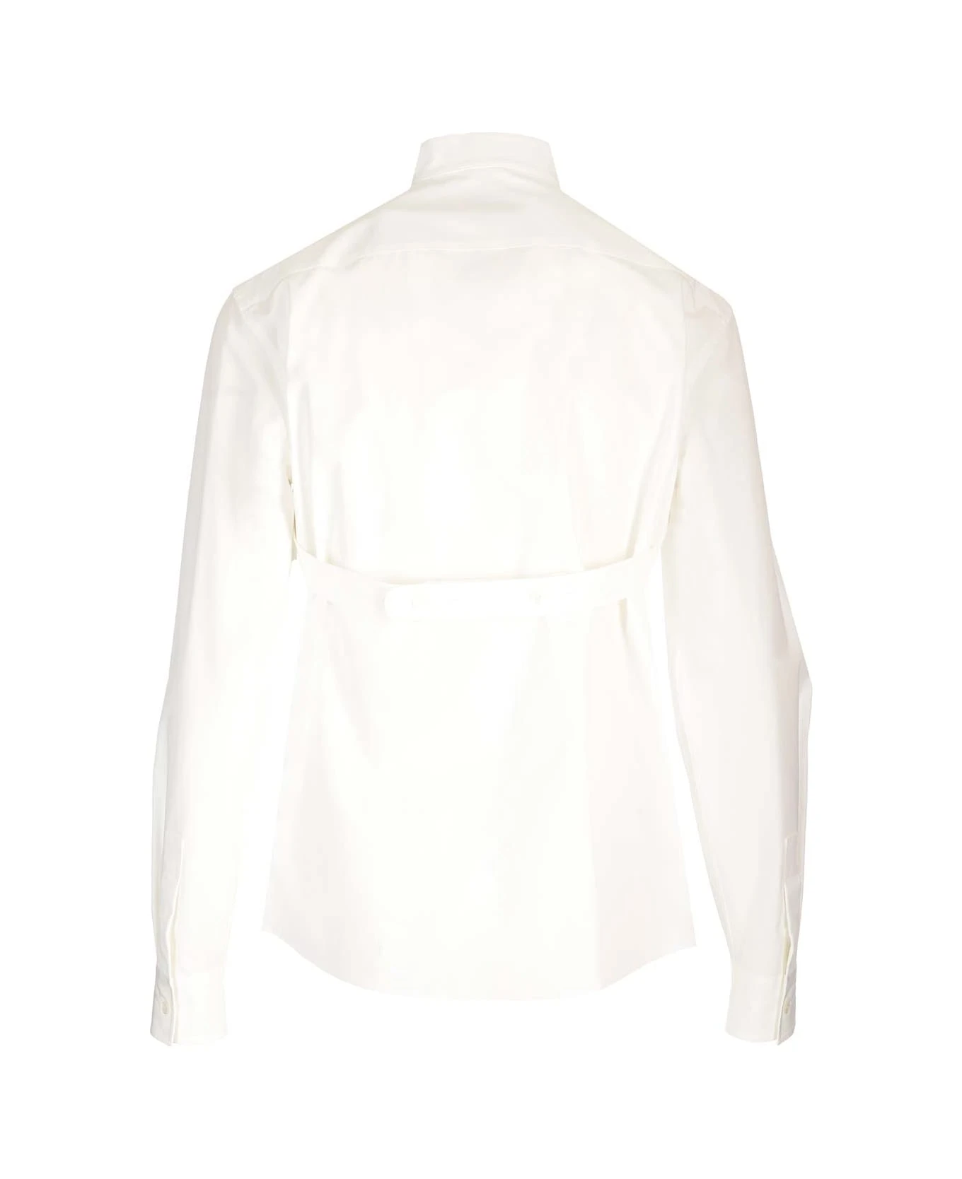 White shirt from Off-White in cotton, long sleeves, stand collar with tone-on-tone crossed bands on the front, buttoned cuffs, rounded hem, button closure, slim fit.