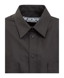 Short-sleeved shirt. Classic collar. Button closure. Two pockets on the front. Embroidered patch on the bottom.