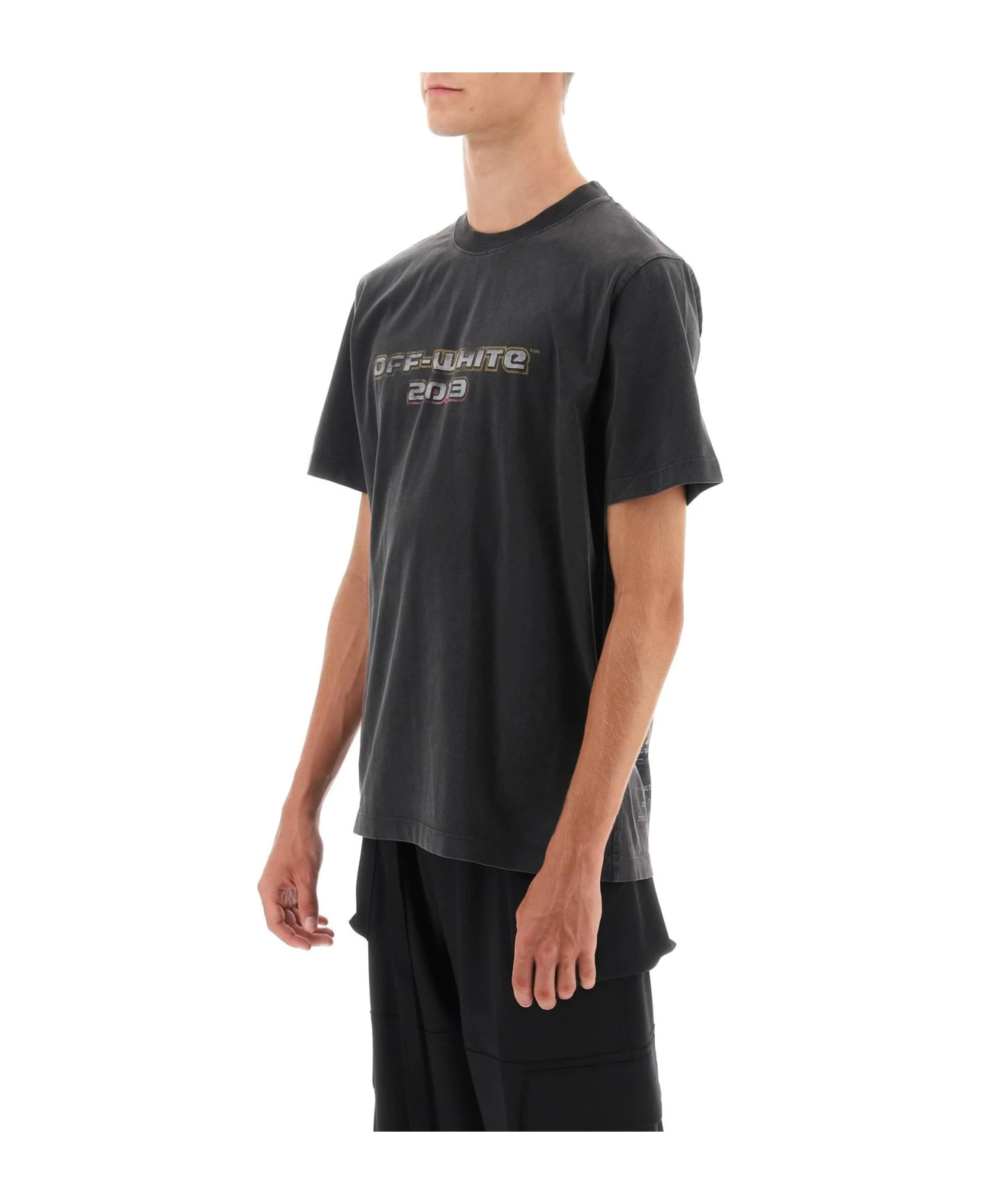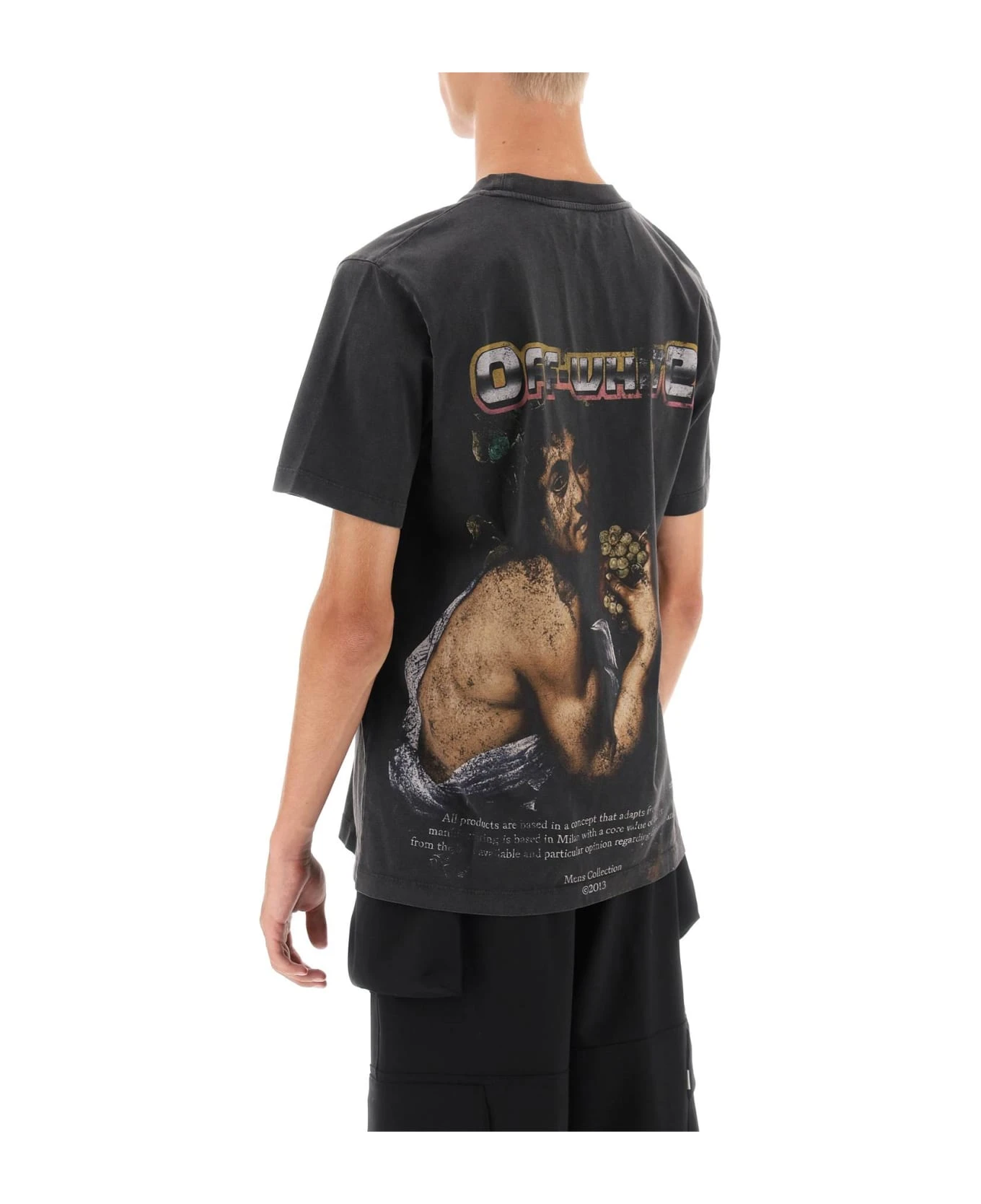 Off White T-shirt made from washed-effect cotton jersey with logo print at chest and maxi Bacchus print at back. It features ribbed crew neck. Regular fit. The model is 187 cm tall and wears size L.