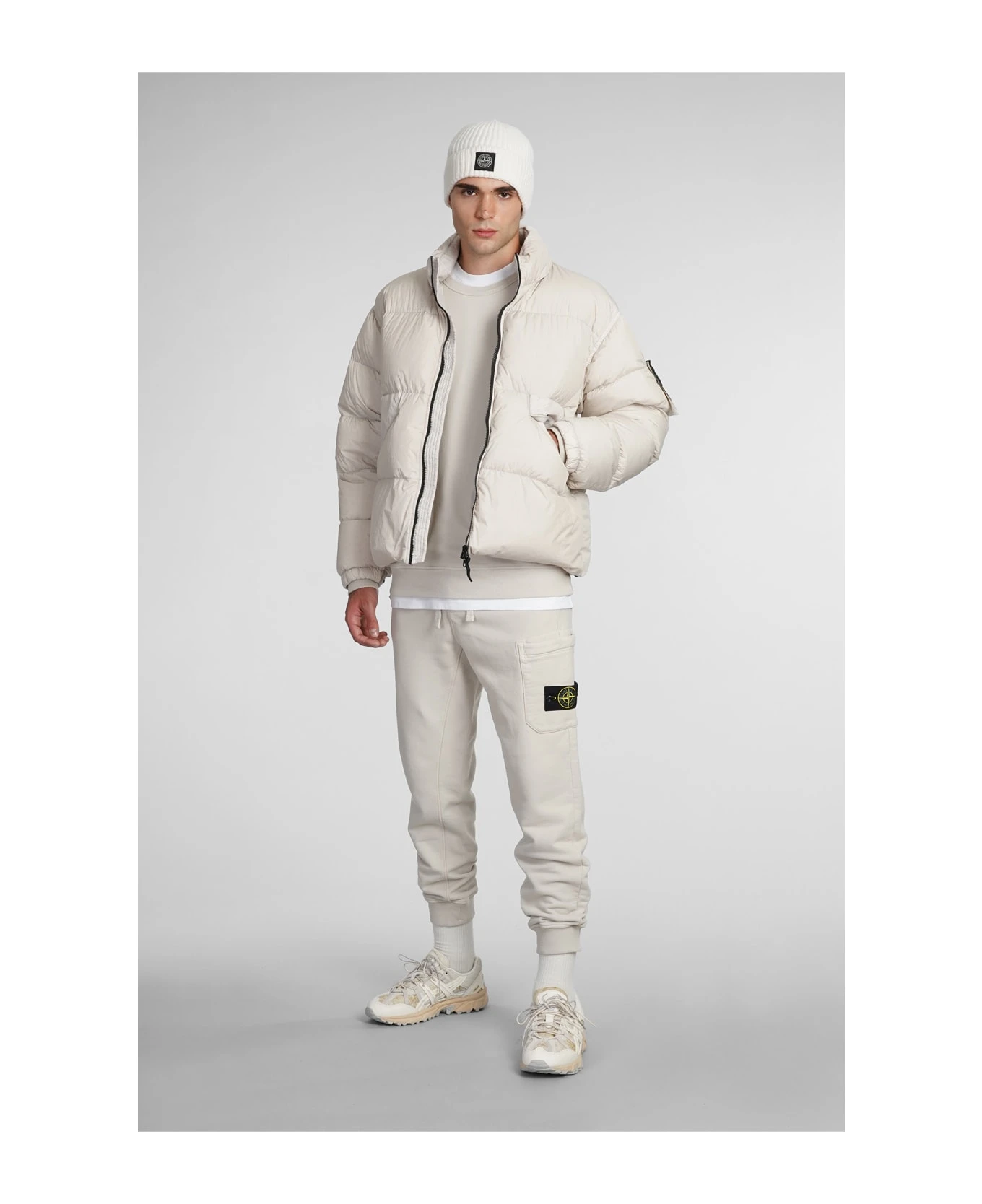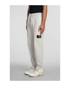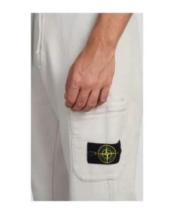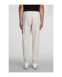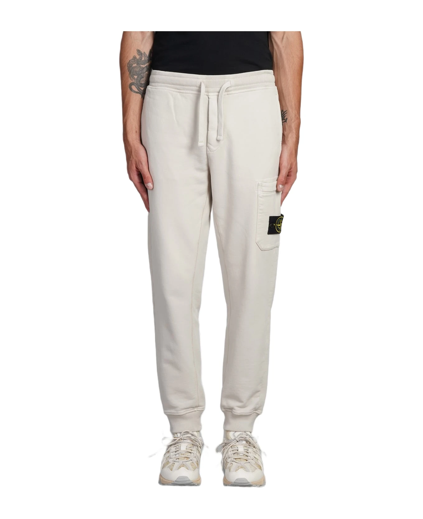 Pants in beige cotton, Drawstring laces, pockets on side, side patch logo, pocket on backside, elastic hem, 100% cotton, Made in Romania, Model is 187cm and wears a size S
