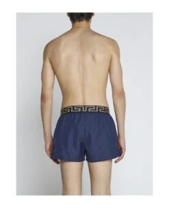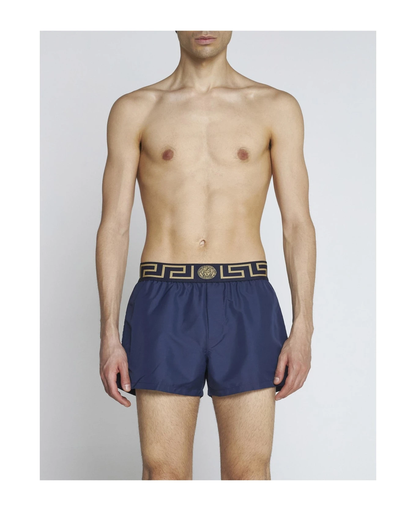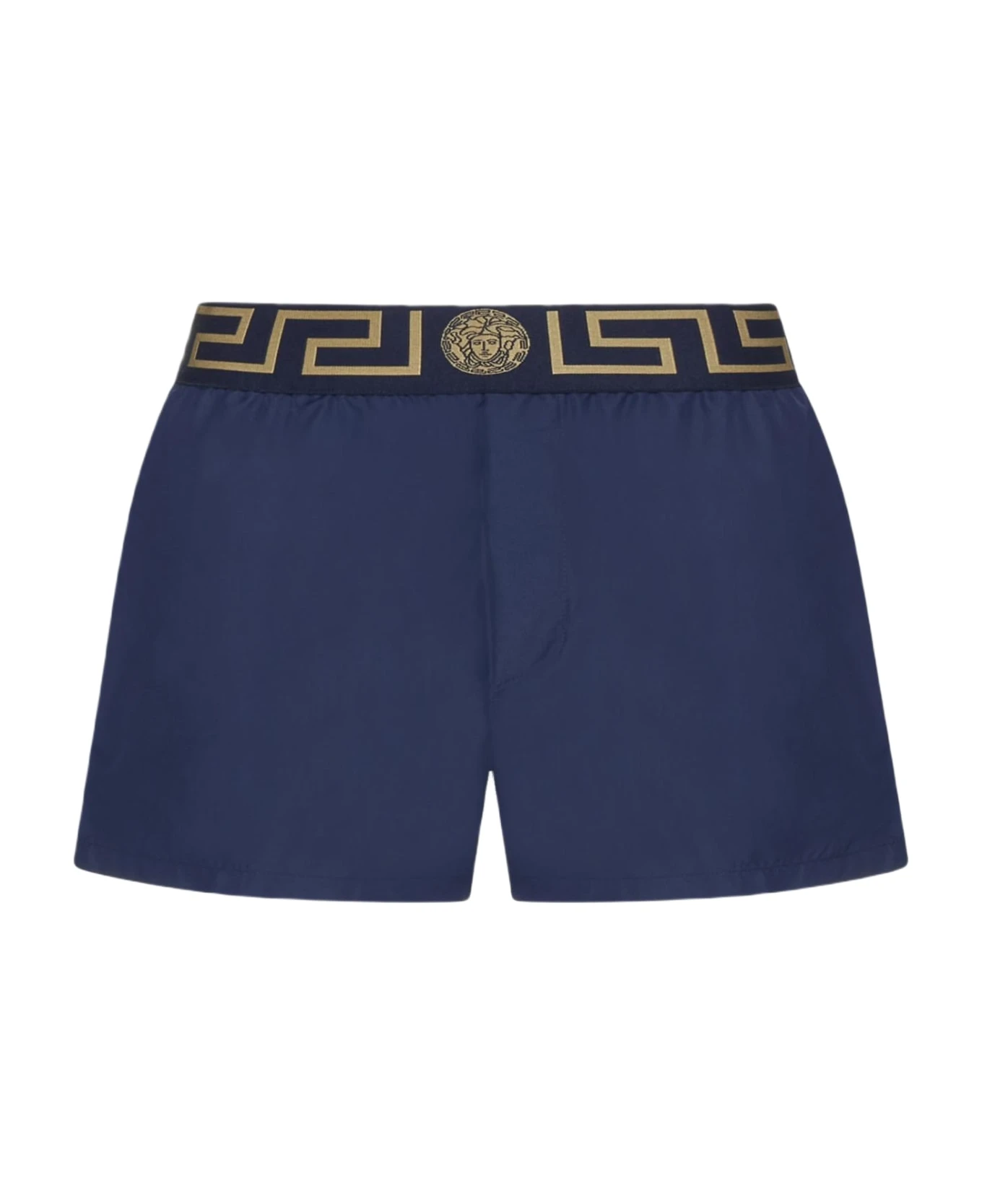 Versace’s blue nylon swim shorts featuring a short style and elasticated waistband with gold-tone Greca and Medusa.