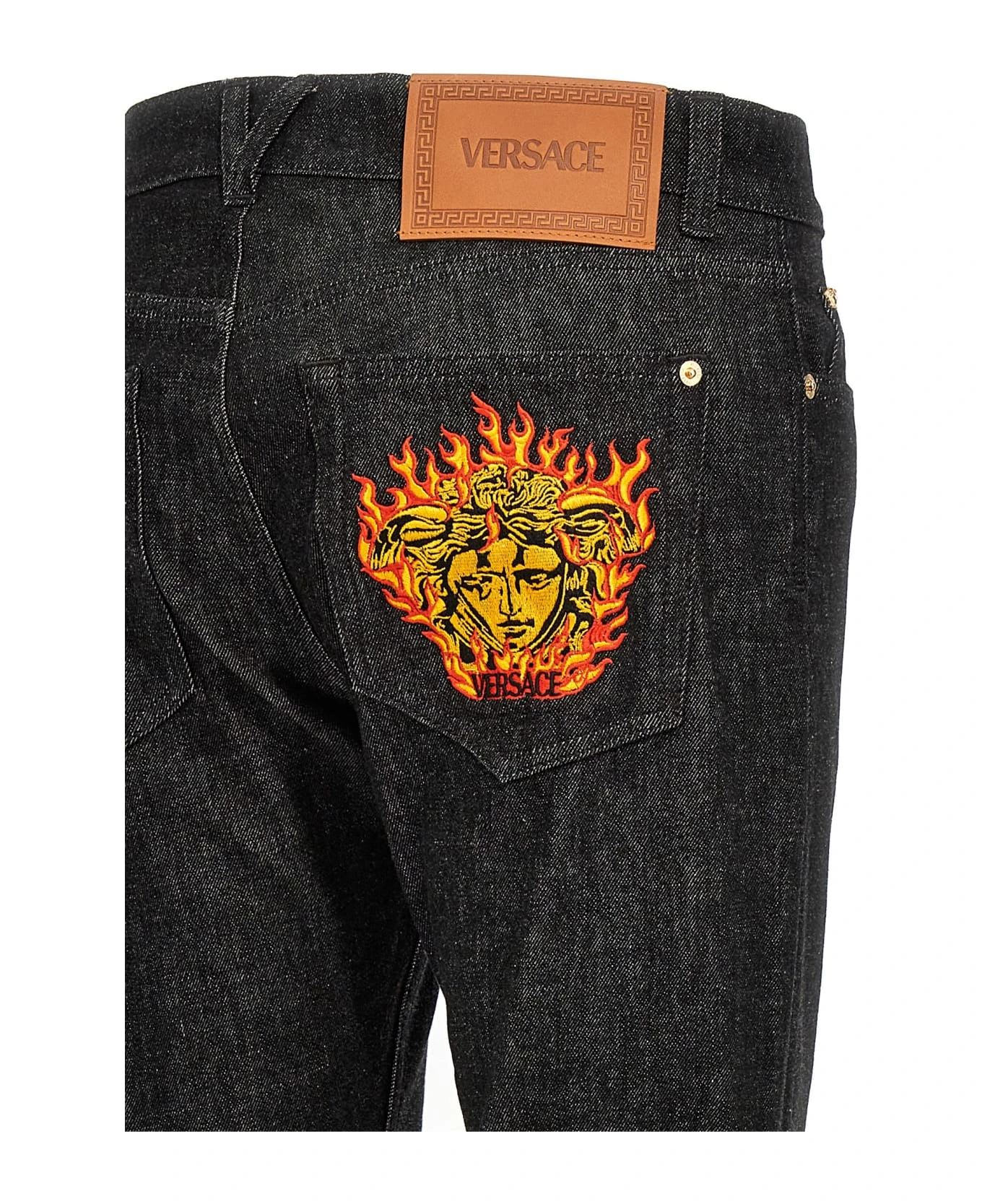 Cotton denim jeans with ‘Medusa Flame’ embroidery at the back, a zip and button closure, five pockets.