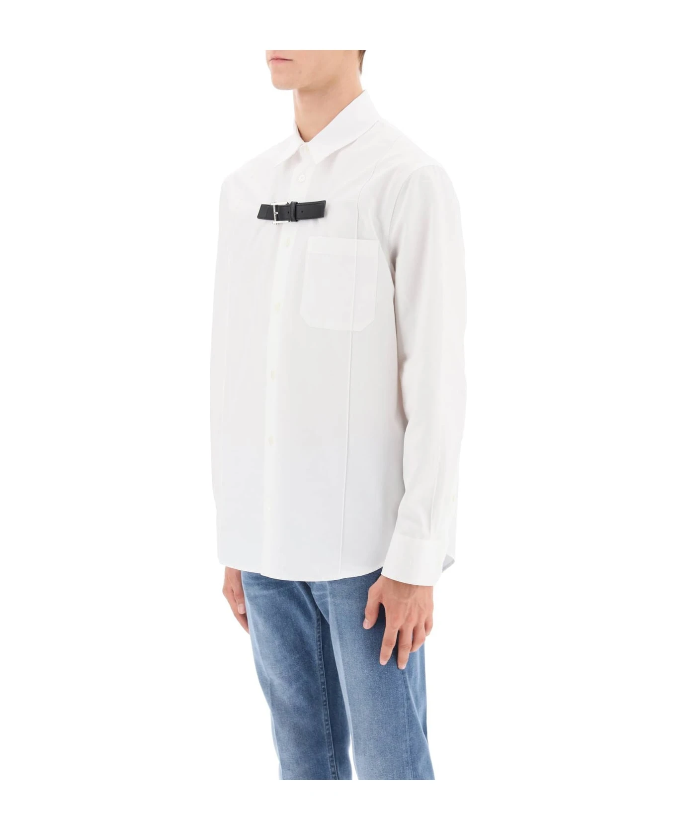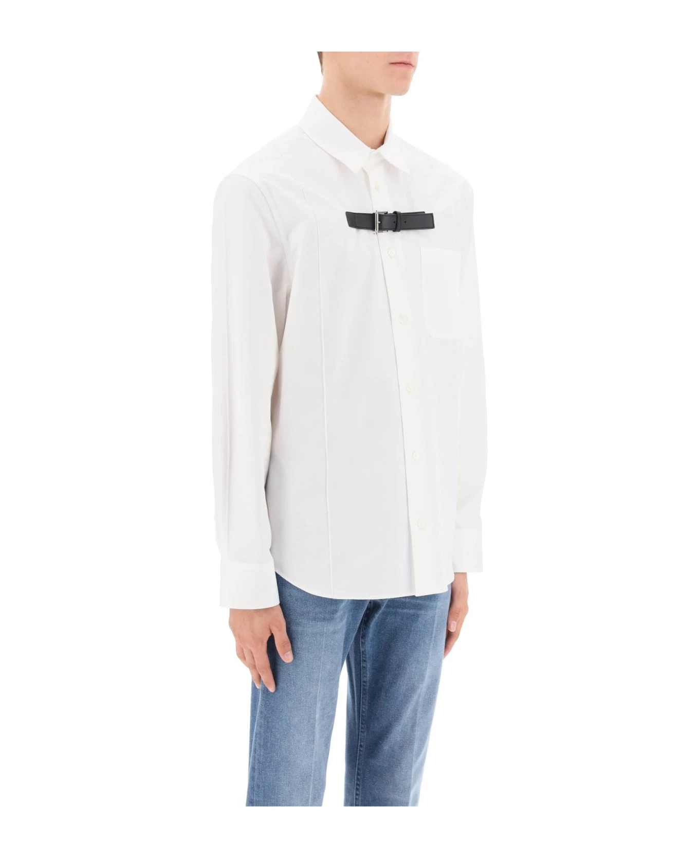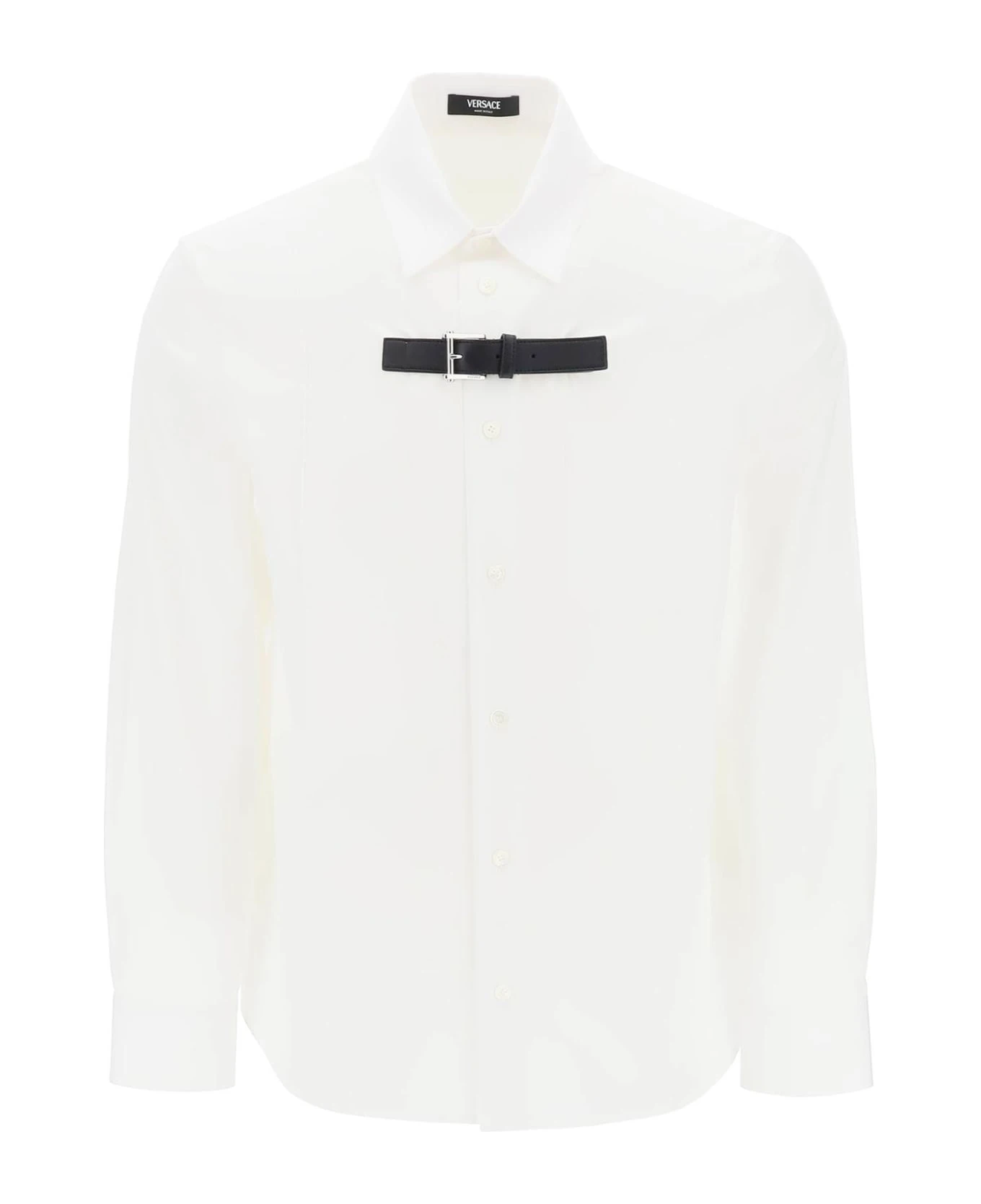 Versace shirt crafted in pure cotton poplin with panel design, enriched by a leather strap with buckle on the chest. It features classic collar, front button closure, chest patch pocket, angled cuffs and shaped hem. Regular fit with boxy cut. The model is 187 cm tall and wears size IT 48.