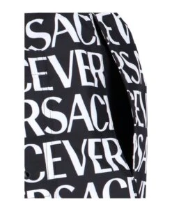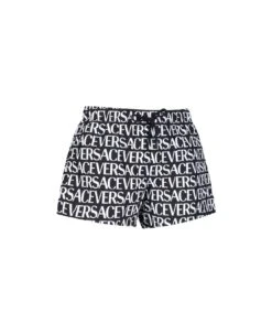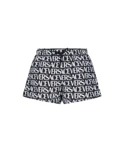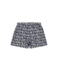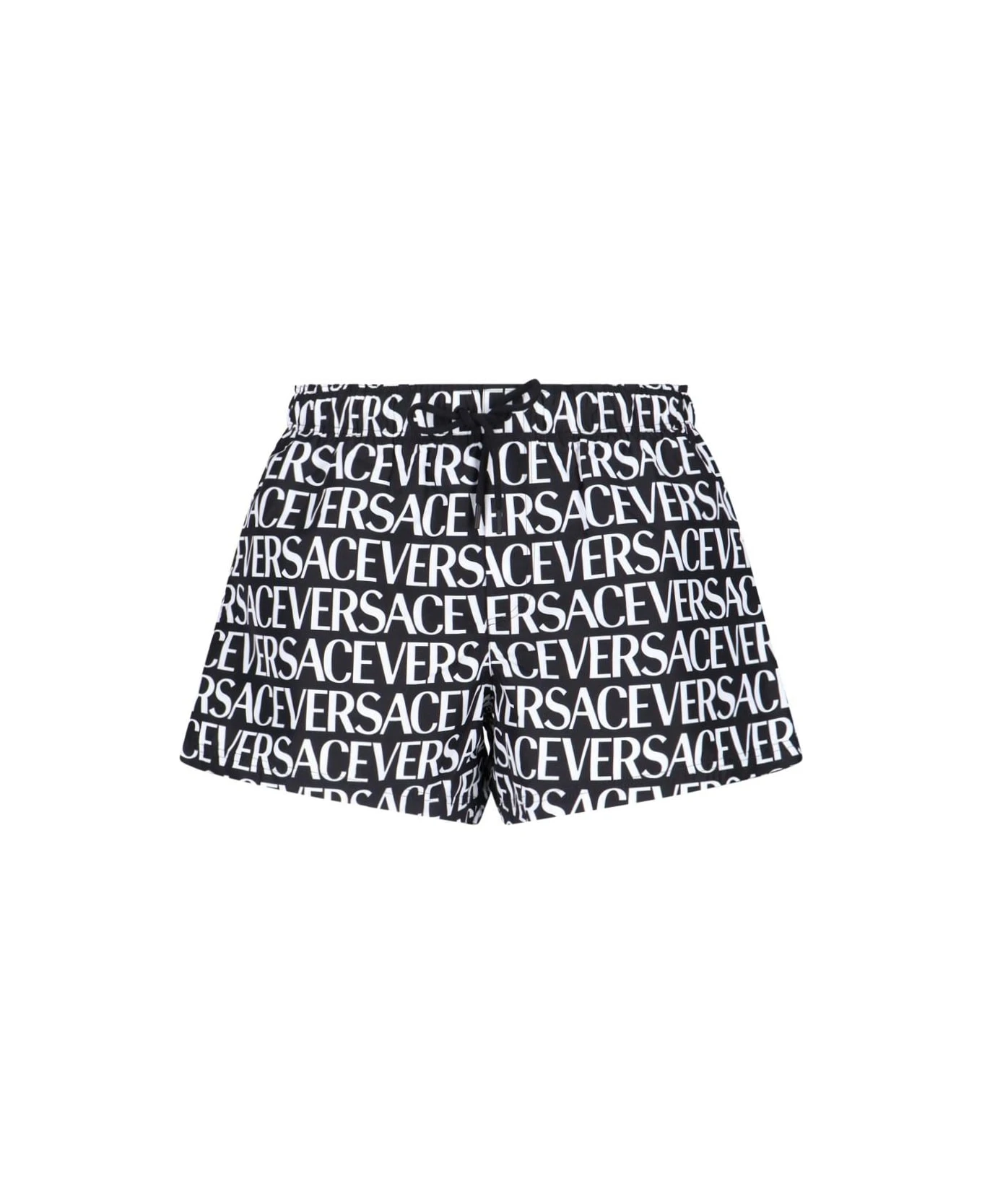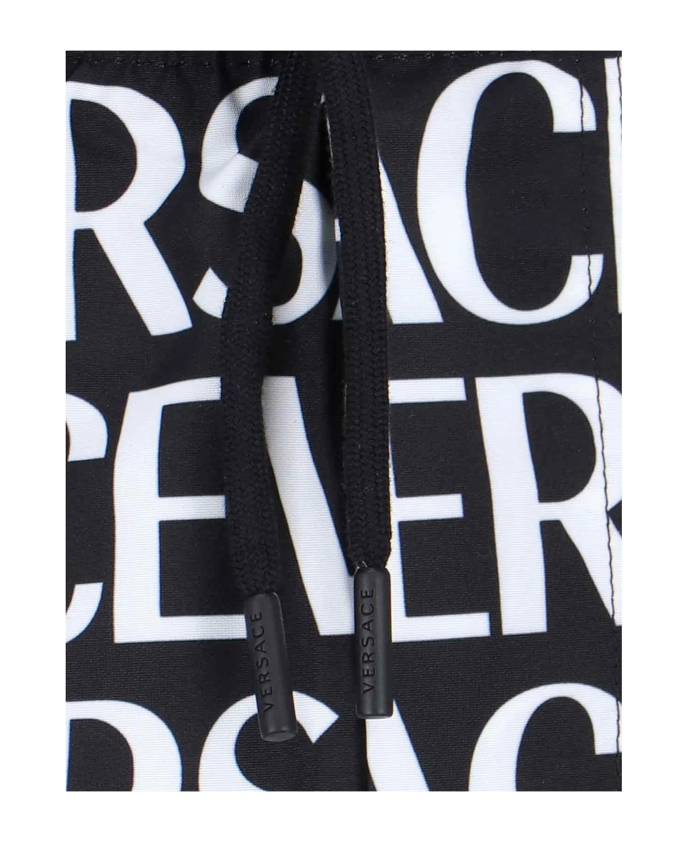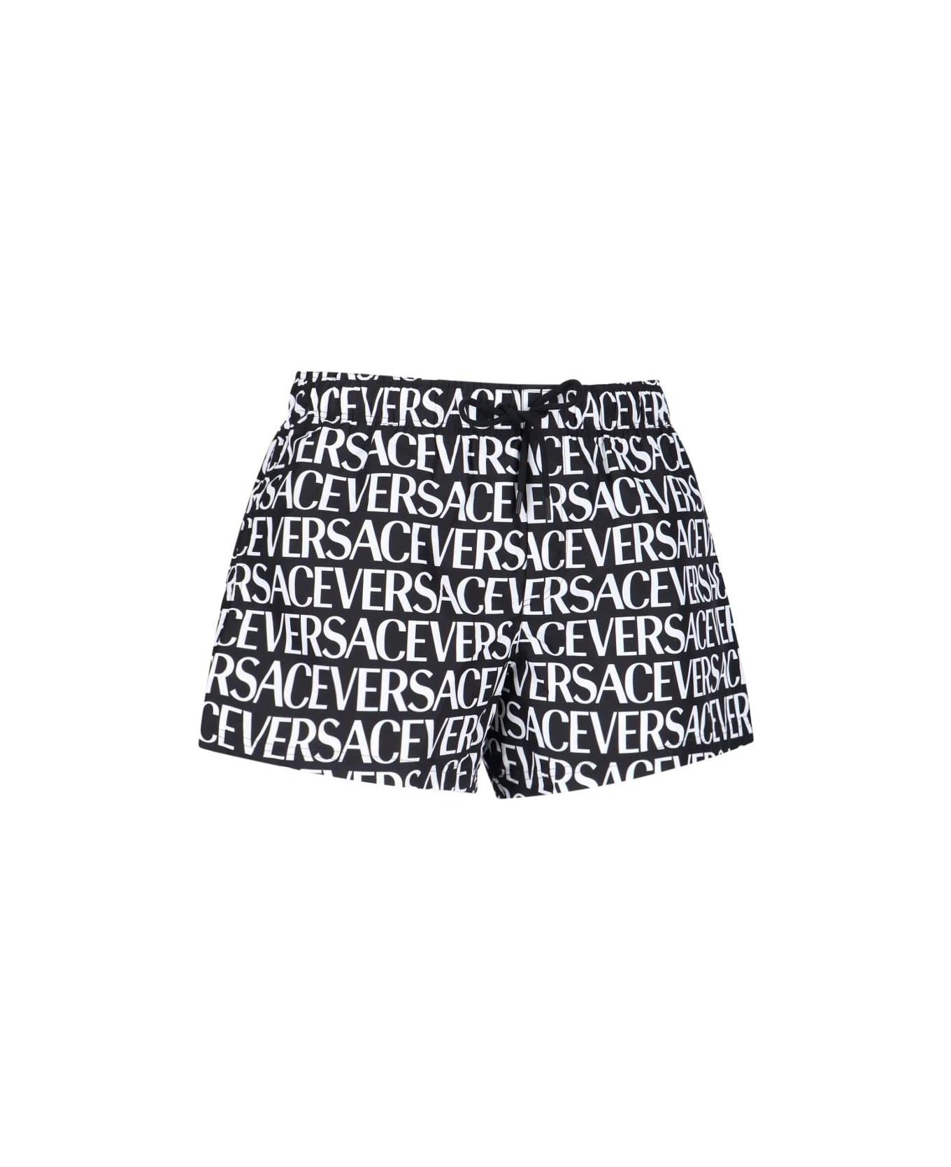 Versace logo swimming shorts, made in blue fabric, with all-over white logo print, elastic waistband, drawstring, two side pockets, one back patch pocket, straight hem.