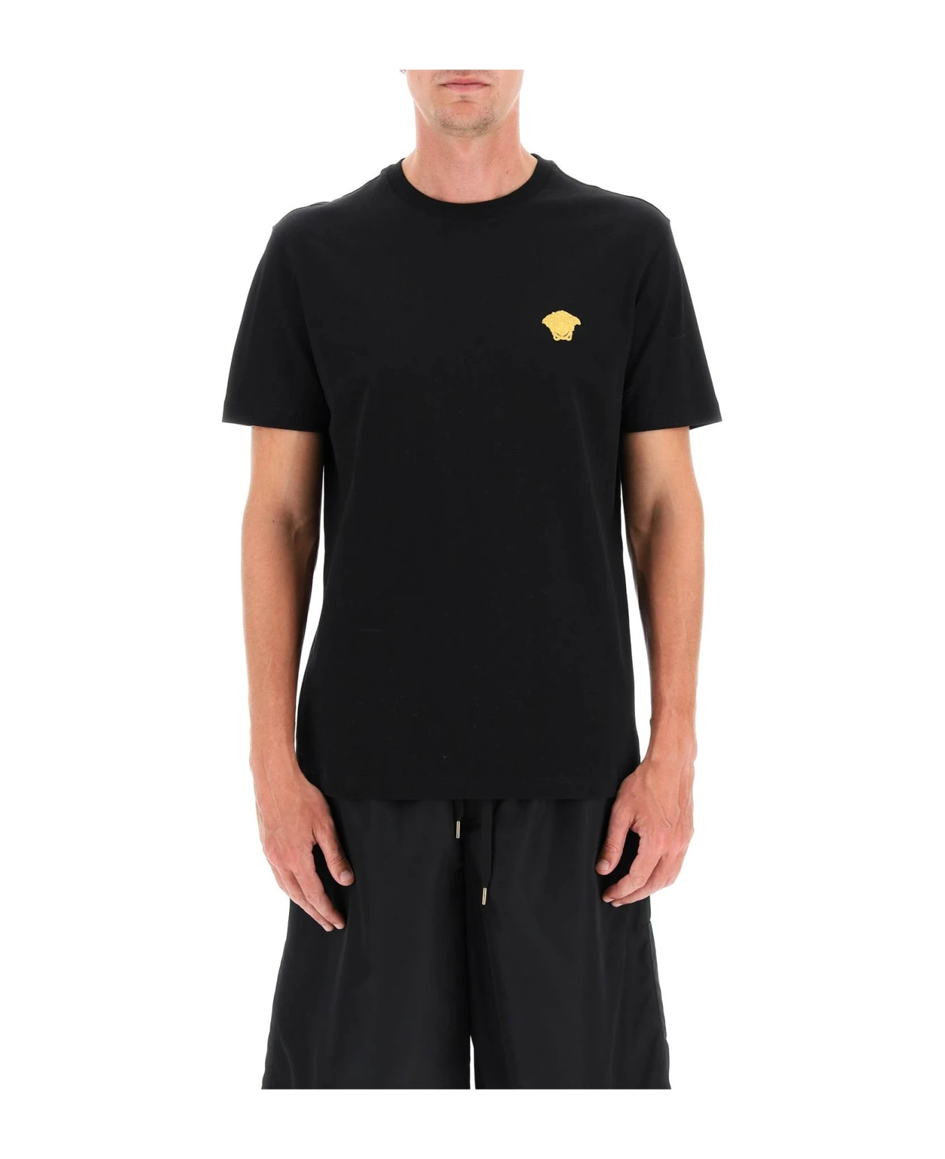 Versace cotton jersey T-shirt embroidered with Medusa logo detail on the chest. Ribbed crew neck. The model is 187 cm tall and wears a size M.