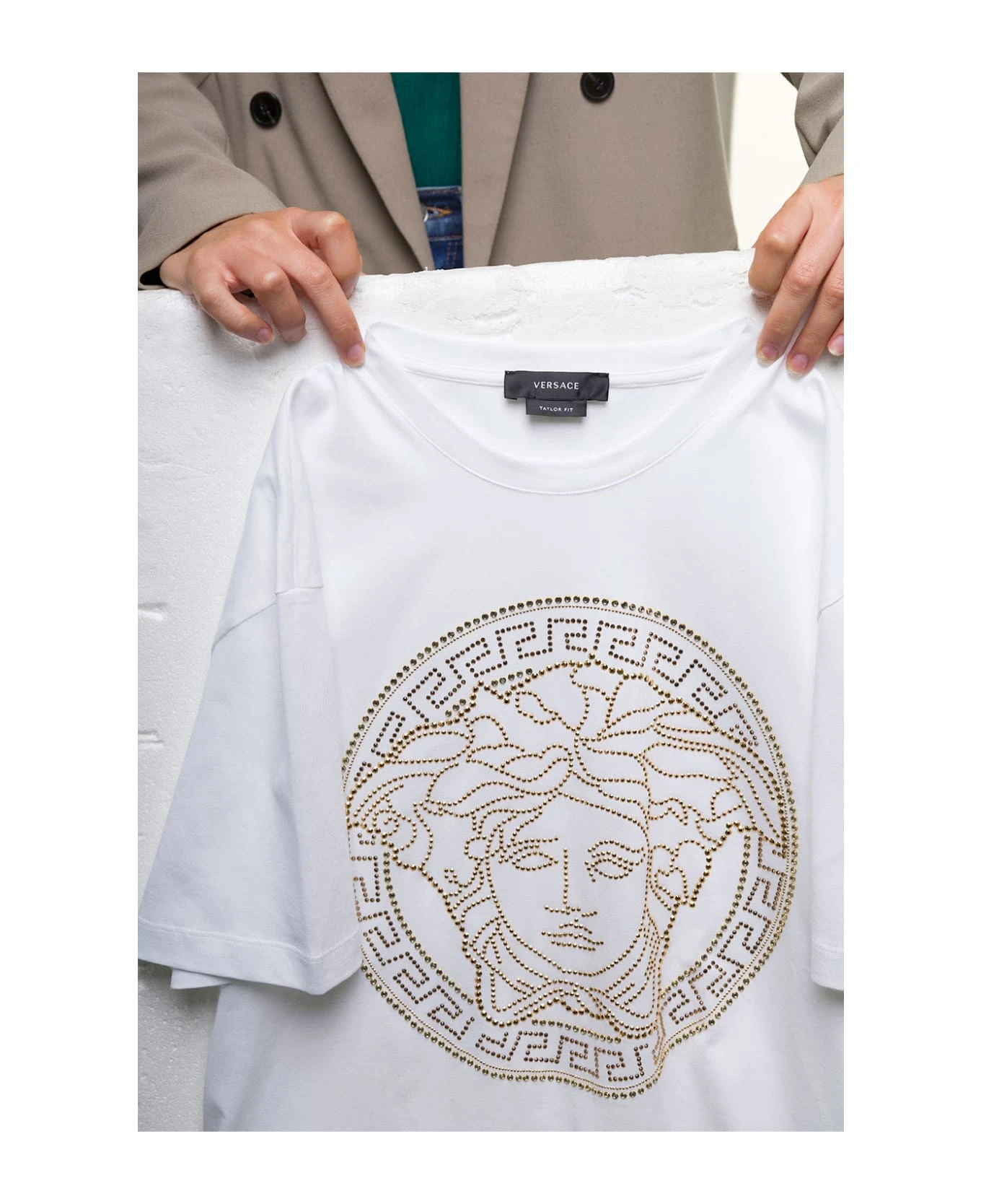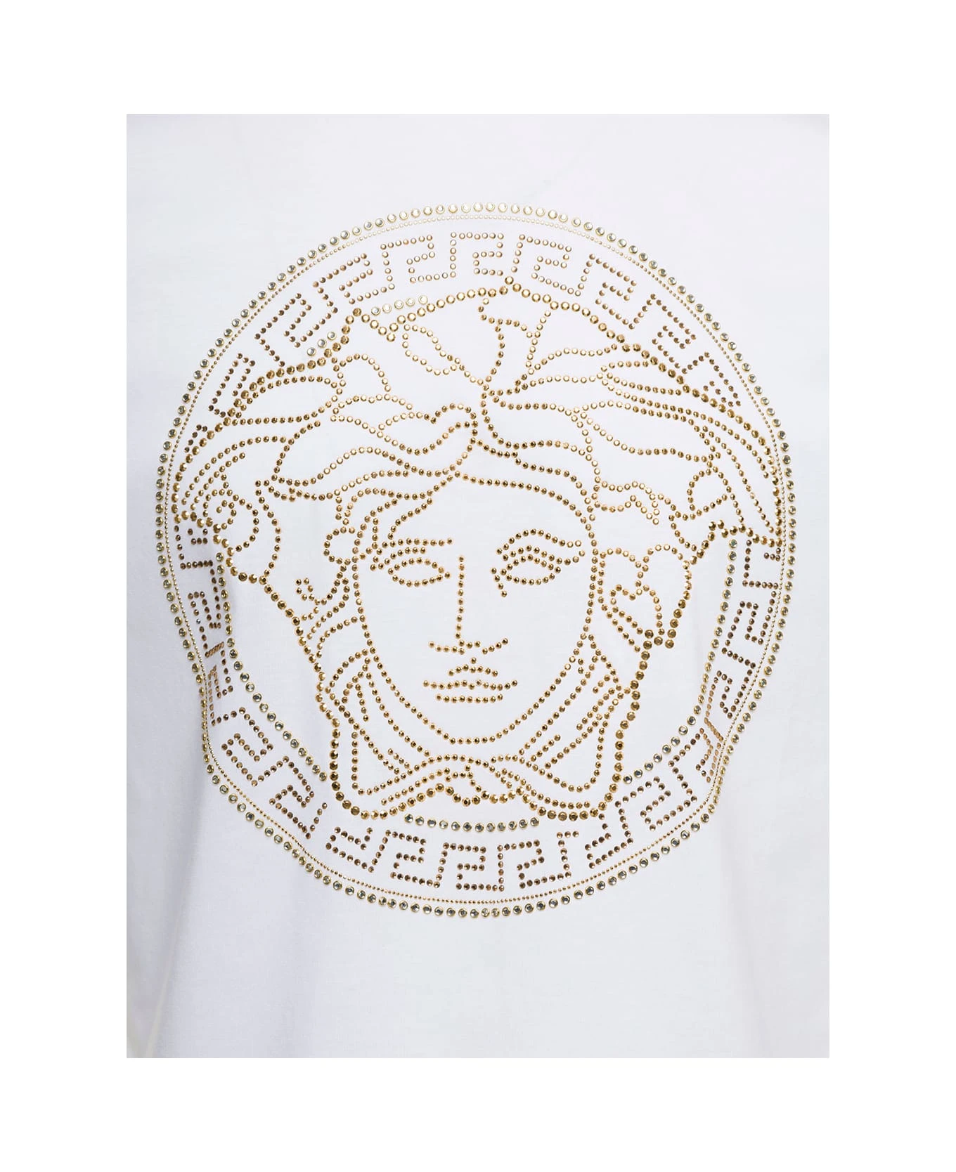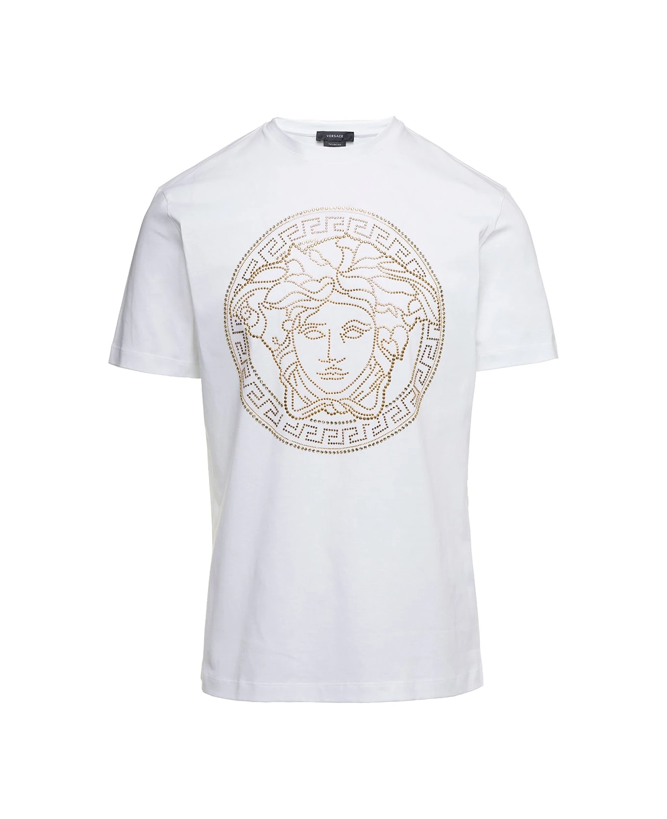 Versace White Crewneck T-shirt With Studded Medusa In Cotton Man